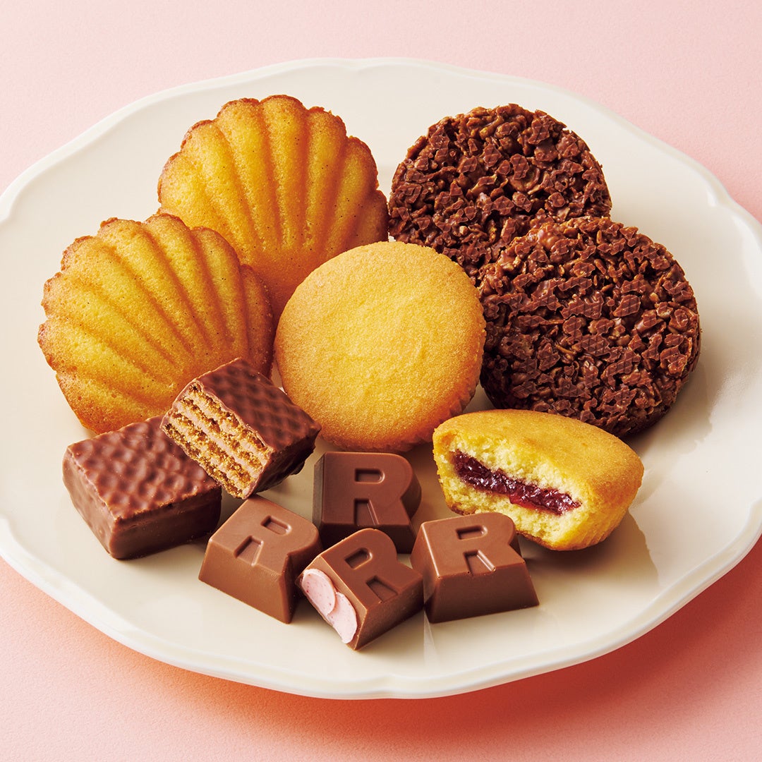 春らしいベリー系のチョコレートの、ロイズアールショコラ[ストロベリー]とチョコレートウエハース[いちごクリーム]や、マドレーヌとガレットといった焼き菓子などを、花びらがあしらわれたような華やかなボックスに詰め合わせました。