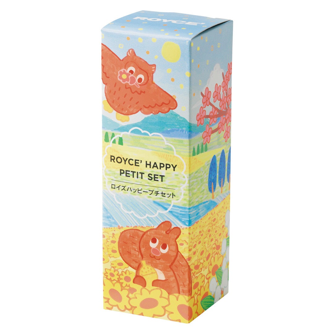 北海道・新千歳空港にあるロイズ チョコレートワールドで人気の、フクロウとリスのロイズポップチョコと、色とりどりのロイズフラワーチョコを、動物たちが描かれたかわいらしいパッケージに詰め合わせました。