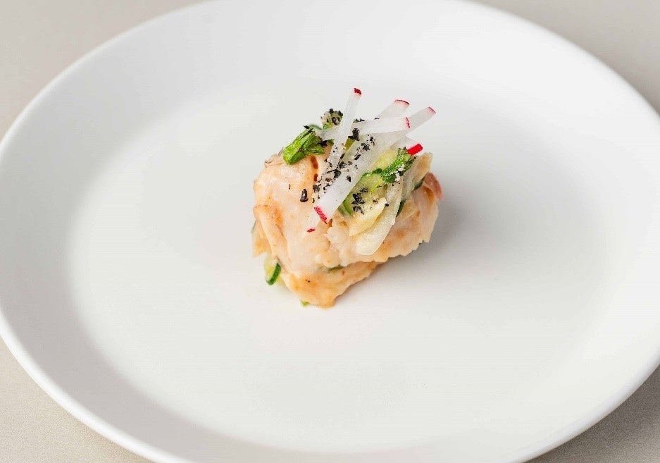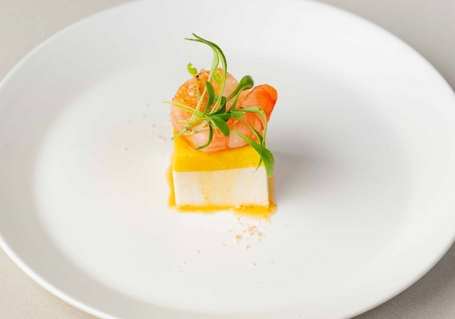 豆腐とクリームチーズに、とうもろこしの甘みを重ねた二層仕立てのムース。プリプリの海老を添え、山椒を効かせたごま油ドレッシングが全体を調和させます。