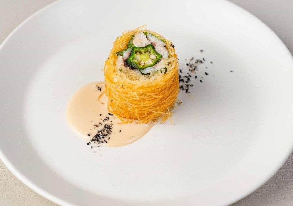 アジとオクラを大葉で包み、カダイフを巻いて軽やかに揚げた一品。白練りごまのソースと純正ごま油で味わう、当店イチオシメニューです。
