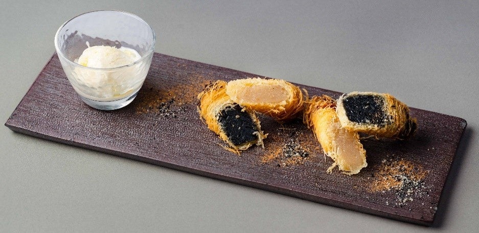 カダイフで包んだ「goma to ようかん」を、かどやの太白ごま油で香ばしくカリッと揚げました。揚げたての濃厚な甘さと、アイスの冷たさが重なる温冷デザートです。