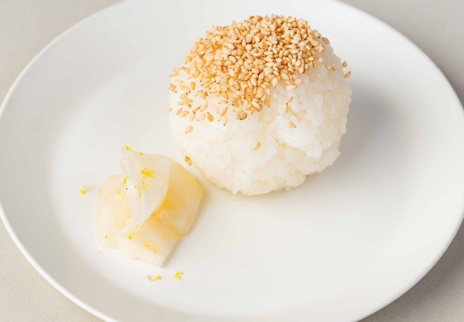 白ごまをまとった梅おかかのおにぎりと、ごまの実オイルで仕上げた蕪の浅漬け。やさしい味わいの組み合わせです。
