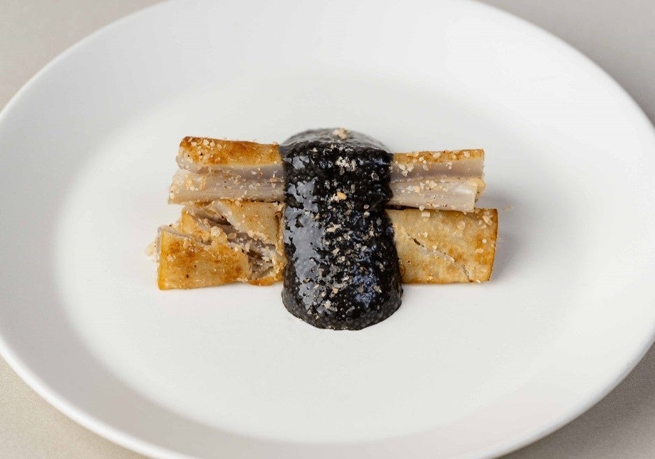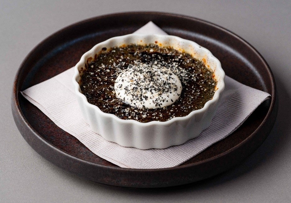 パリッと香ばしいキャラメリゼと、中のなめらかな黒ごまクリームが合わさり、食感まで楽しめるデザート。