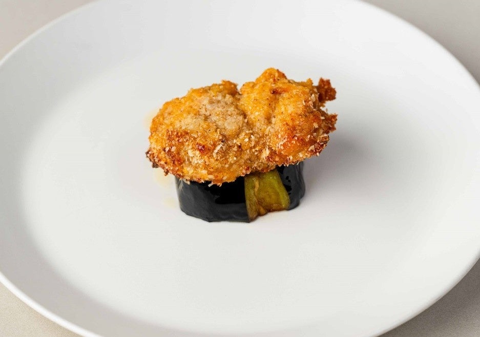 アジとオクラを大葉で包み、カダイフを巻いて軽やかに揚げた一品。白練りごまのソースと純正ごま油で味わう、当店イチオシメニューです。