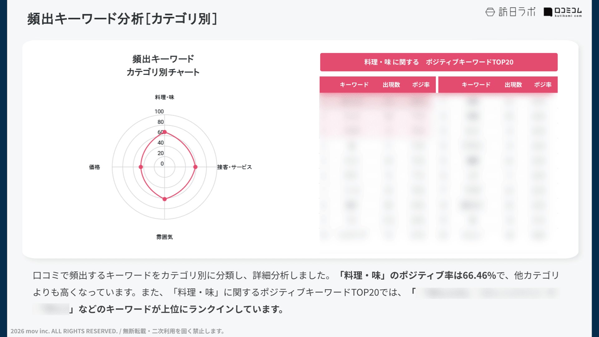 「料理・味」に関するポジティブキーワードTOP10では、「◯◯◯◯」「◯◯◯」などのキーワードが上位にランクインしており、お客様の評価ポイントであることが伺えます。