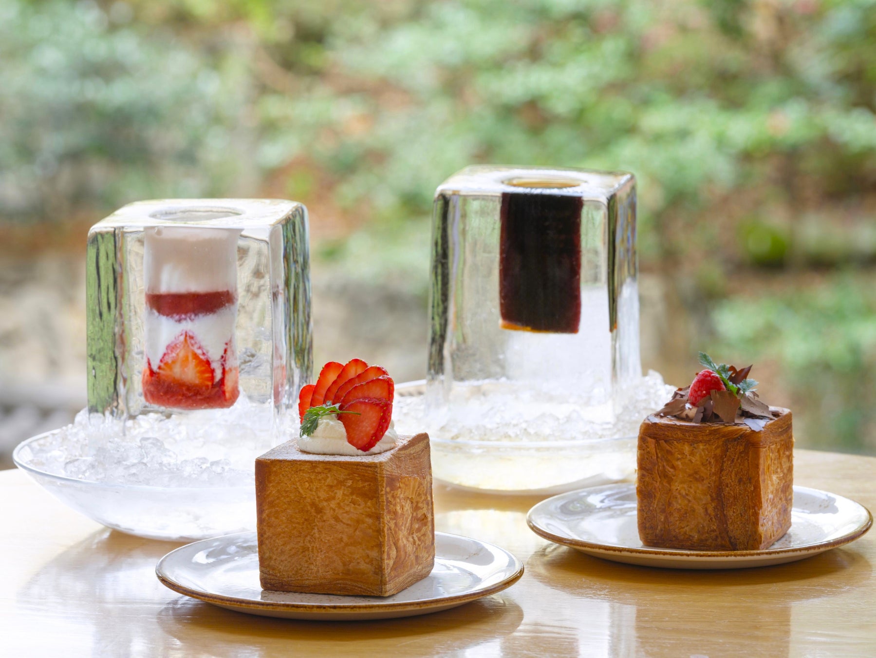 5月15日(金)までの期間中は、この「アイス ストロベリーラテ」と「コールドブリューコーヒー」の2種を、5月18日(月)より9月30日(水)までの期間は「アイス抹茶ラテ」とコールドブリューコーヒー」の2種を、氷の器をイメージした7cm四方のキューブクロワッサンとアイスクリームを組み合わせた特別セットとしてご提供いたします。
