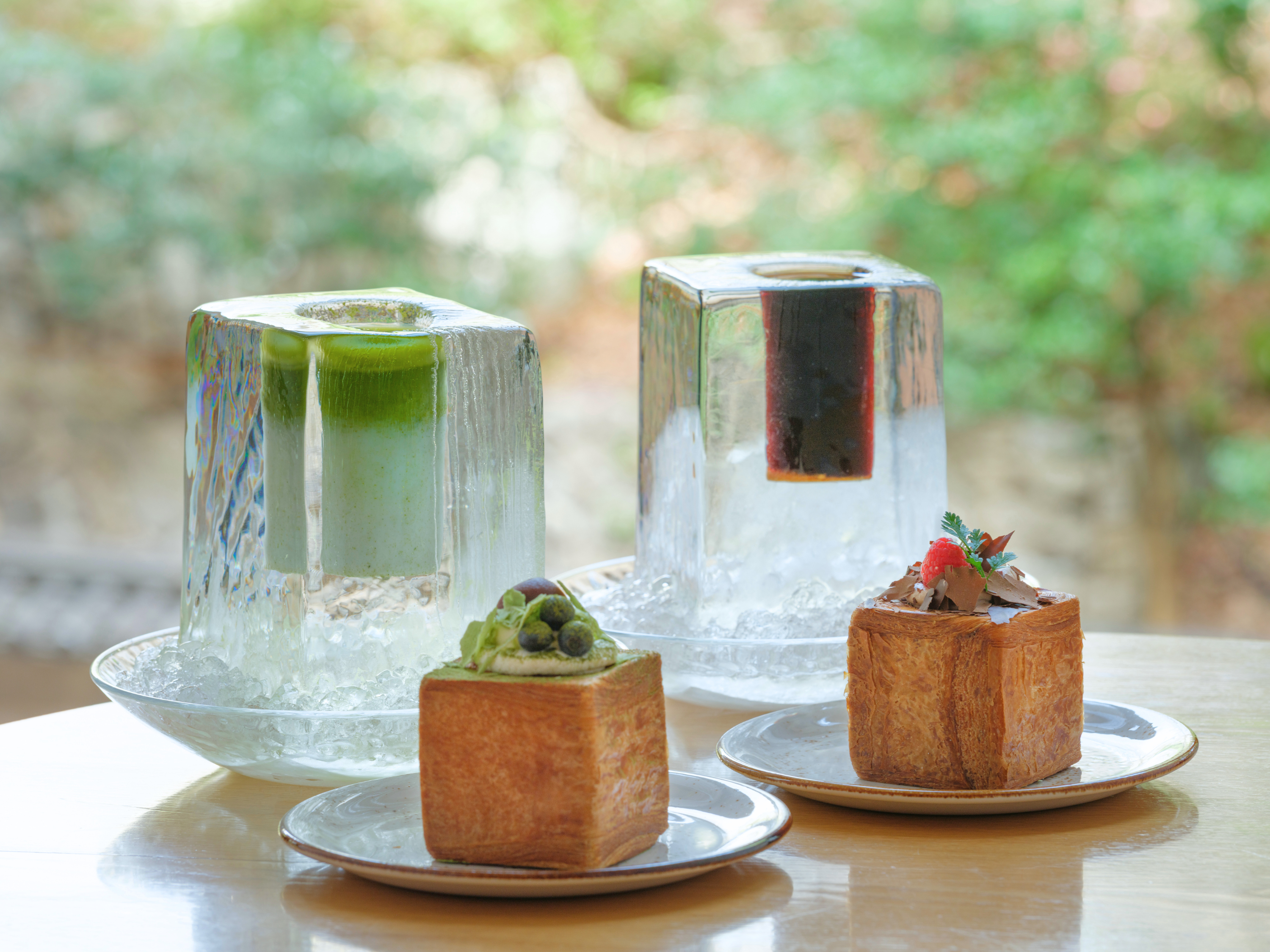 5月15日(金)までの期間中は、この「アイス ストロベリーラテ」と「コールドブリューコーヒー」の2種を、5月18日(月)より9月30日(水)までの期間は「アイス抹茶ラテ」とコールドブリューコーヒー」の2種を、氷の器をイメージした7cm四方のキューブクロワッサンとアイスクリームを組み合わせた特別セットとしてご提供いたします。