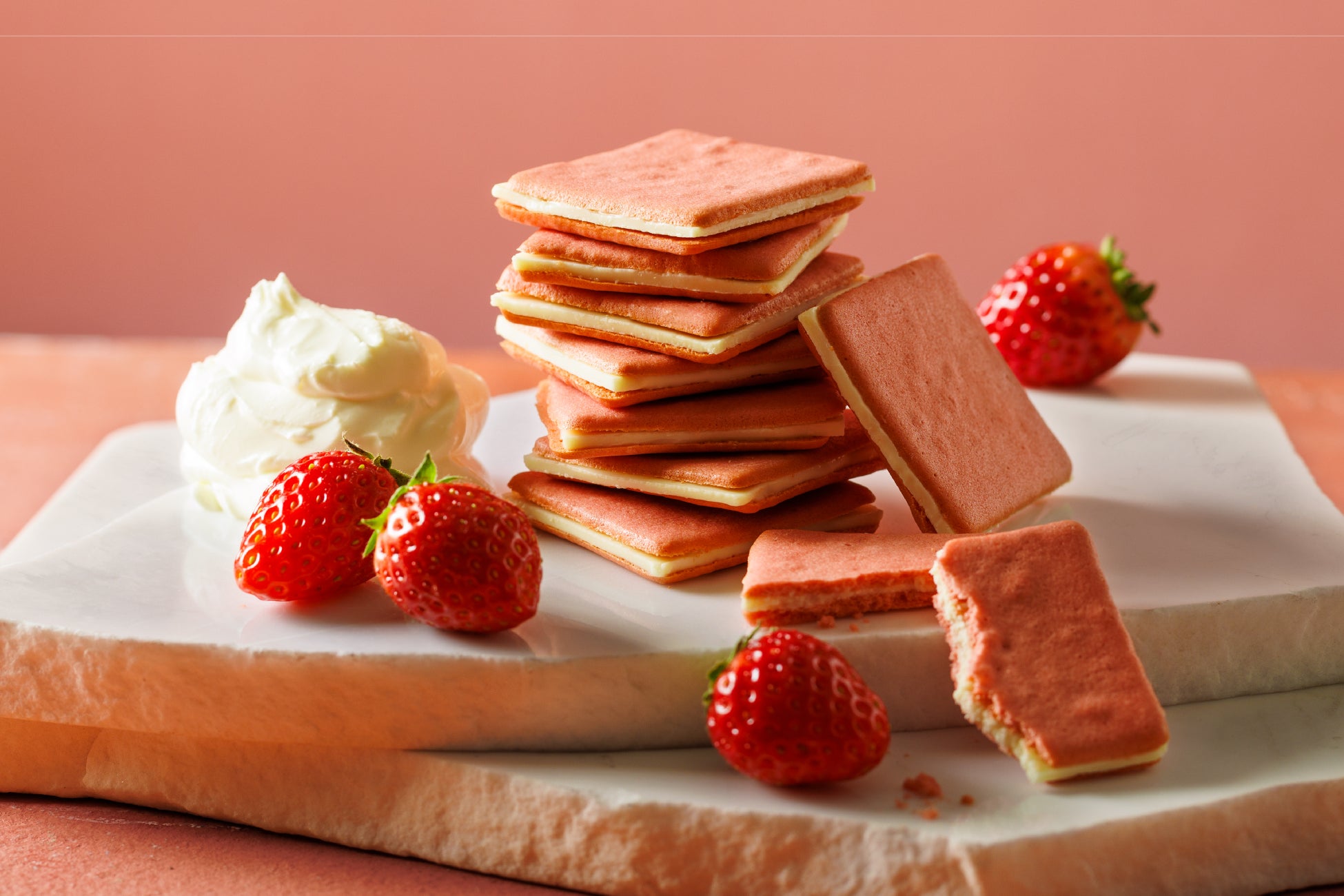 『ストロベリー&マスカルポーネクッキー』は、春を先取りした華やかなピンク色が目を引く、 フルーティーなストロベリークッキー。ミルク感のあるやさしい甘さのマスカルポーネチーズ風味のチョコ※1をサンドして、サクサク食感に仕上げました。