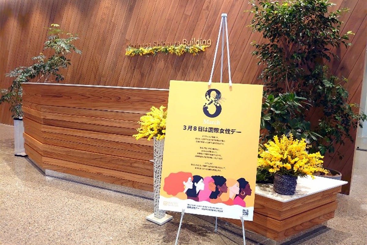 森永製菓株式会社では、国際女性デーに合わせ、本社オフィスをミモザをモチーフにした装飾で彩りました。エントランスには「3月8日は国際女性デー」をテーマにしたビジュアルとともに、国際女性デーの象徴であるミモザの花を用いた装飾を設置。従業員や来訪者に向けて、国際女性デーの意義やメッセージを発信しています。