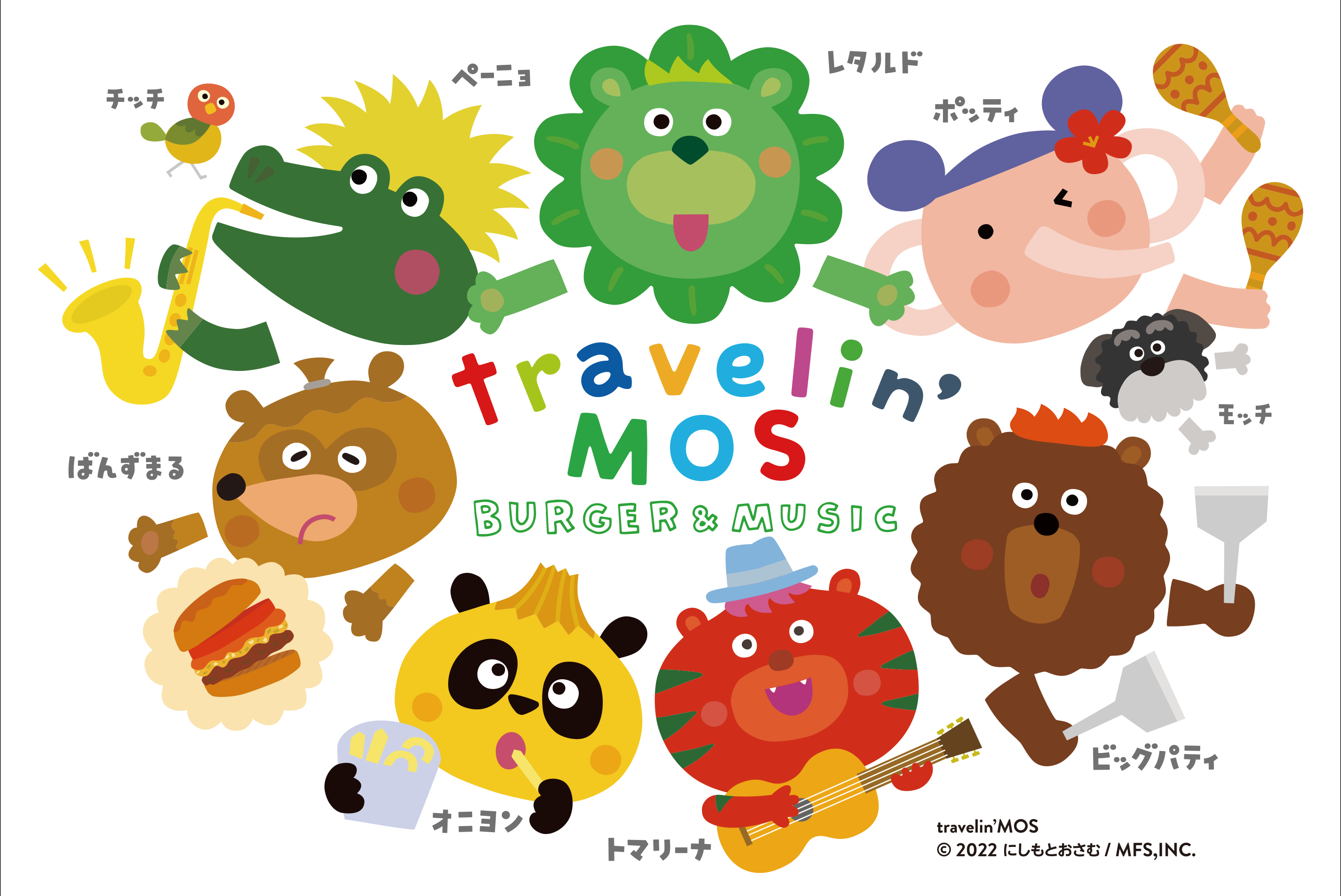 「トラベリンモス」はお子さま向けセットメニュー「モスワイワイセット」や公式サイトの子ども向けコンテンツに登場するストアキャラクターです。レタス、トマト、パティ(お肉)、バンズなど、モスバーガーの商品に使用している具材と子どもが好きな動物を合わせた、7人のバーガーズーとその仲間で構成されています。