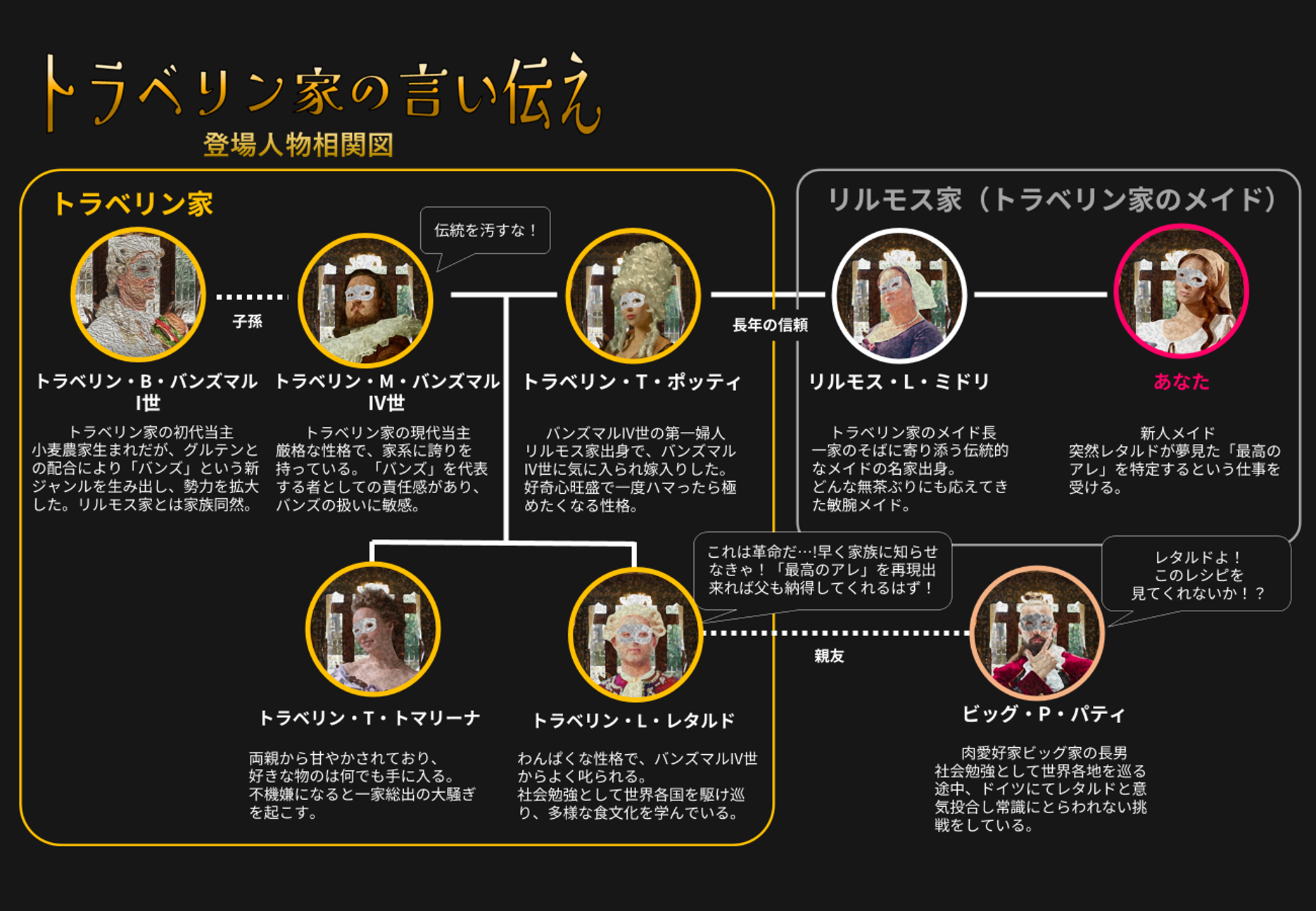本プレミアムシアターの参加者限定のトラベリン家の秘伝ドリンク。物語のキーマン、トラベリン家の名前を冠したドリンクです。物語の一因として、是非味わっていただきたい一品です。