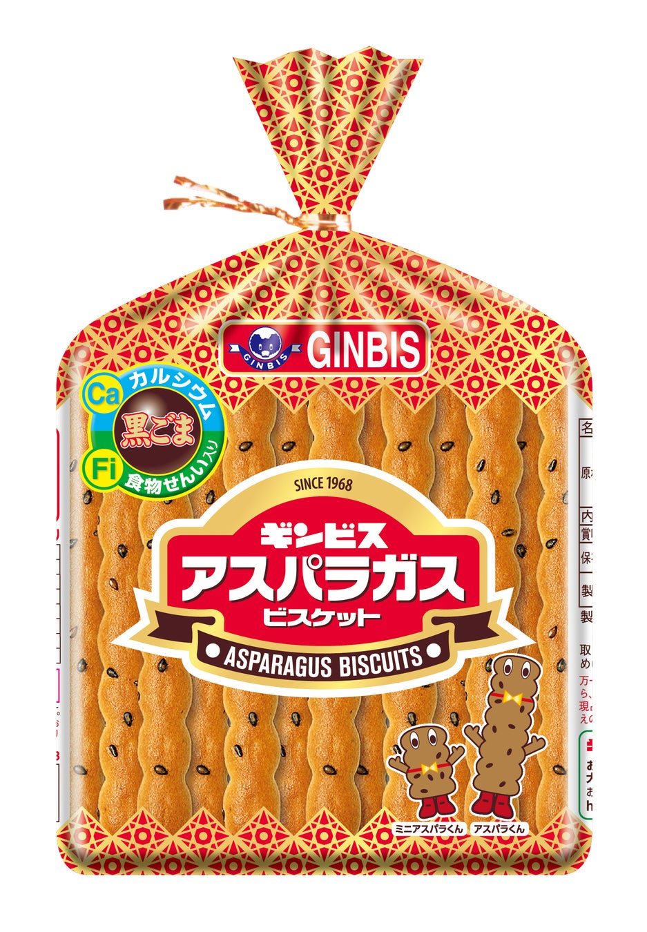 「アスパラガスビスケット」は1968年に発売のビスケット。当時のビスケットといえば、丸形や楕円形、四角の形状が主流だった中、経営方針である『3つのI』のひとつ「Independent(独創性)」の考えのもと革新的なスティック型で発売。発売当初から現在まで巾着のパッケージはデザインがほとんど変わっていません。 素朴な甘じょっぱさが魅力で、からだに優しい食物繊維とカルシウムを配合。8つの節があることが特長で、”外はカリッと、中はサクッと”した食感が楽しめます。