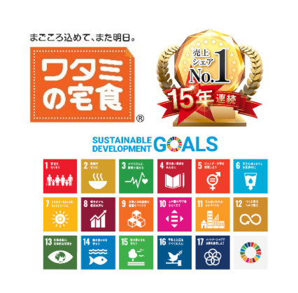 「ワタミの宅食」は、日替わりのお食事と“まごころ”をお届けすることで“社会を支えるインフラ”となることを目指し、事業を展開しています。お弁当・お惣菜は、お客さまと同じ地域に住む“まごころスタッフ”がお届けしています。毎日約23万食のお弁当・お惣菜をお届けしており、病者・高齢者食宅配市場「売上シェア15年連続 No.1」(2010年~2024年)※を達成しています。2020年3月には、業界として初めて、自社弁当容器を回収し、新たな容器としてリサイクルする取り組みを全国に展開するなど、SDGsの目標達成にも貢献しています。