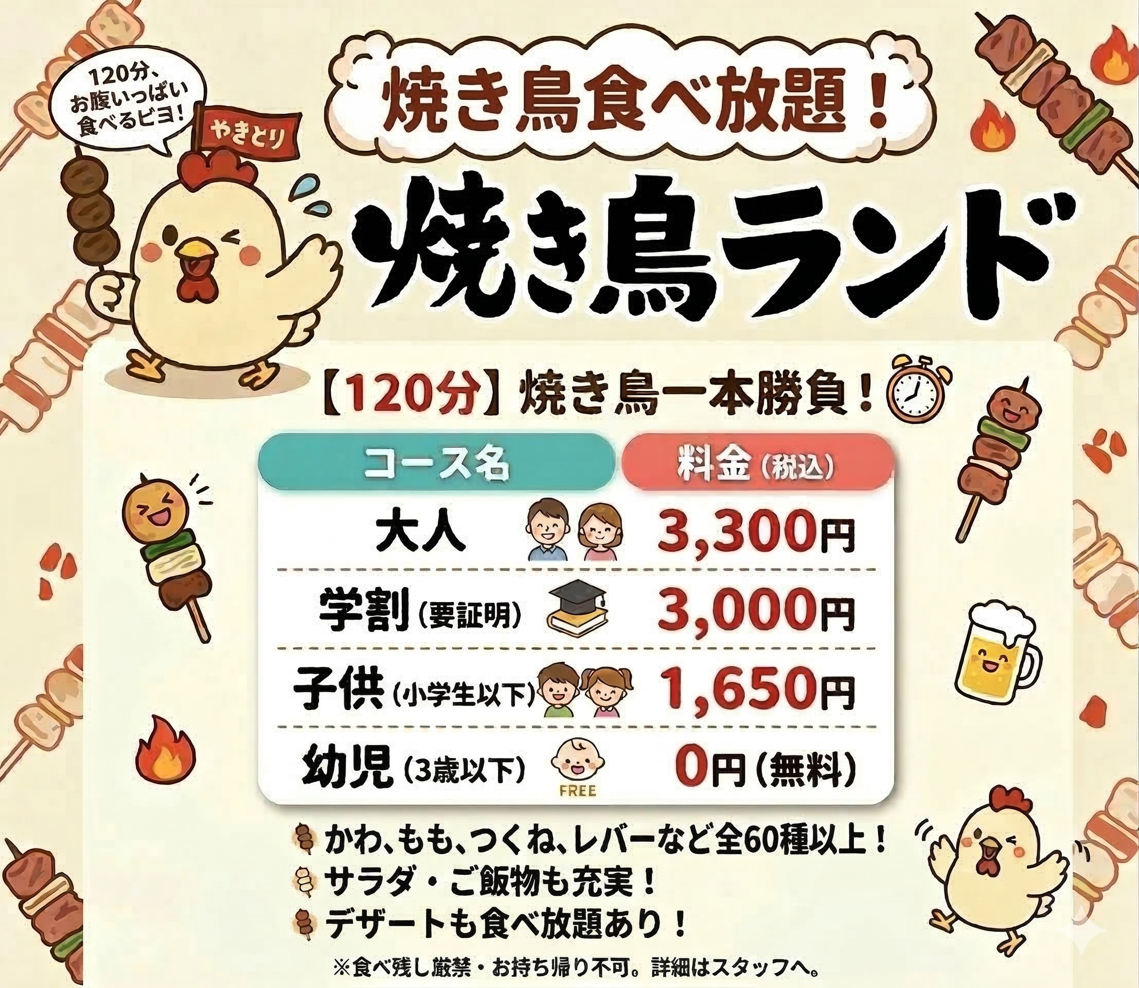~学割値引き!!小学生以下のお子様は半額!!幼児は無料で焼き鳥食べ放題参加OK!!~