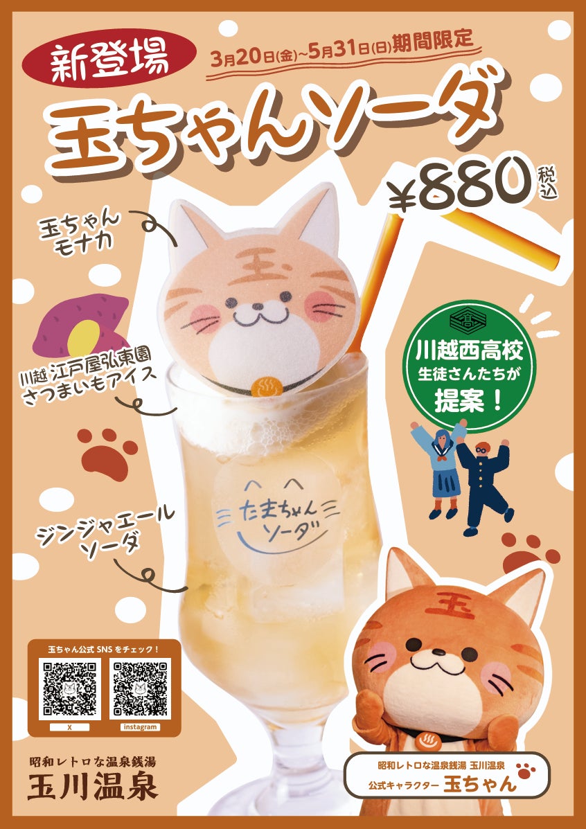 株式会社温泉道場(埼玉県比企郡ときがわ町、代表取締役 山崎寿樹)が運営する日帰り温泉・昭和レトロな温泉銭湯 玉川温泉(埼玉県比企郡ときがわ町)は、2026年3月20日(金)より新メニュー「玉ちゃんソーダ」を玉川食堂にて提供開始します。