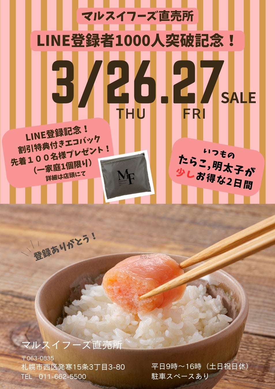 たらこ・明太子製造会社 マルスイフーズ株式会社(札幌市西区発寒15条3丁目3-80)は、LINE登録者1,000人突破を記念し、2026年3月26日(木)、27日(金)にイベントを開催いたします。このイベントでは、日頃の感謝を込めまして、家庭用切れ子(たらこ、明太子)の割引や、マルスイフーズオリジナルのエコバッグを先着100名様(一家庭1個限り)にプレゼントいたします!