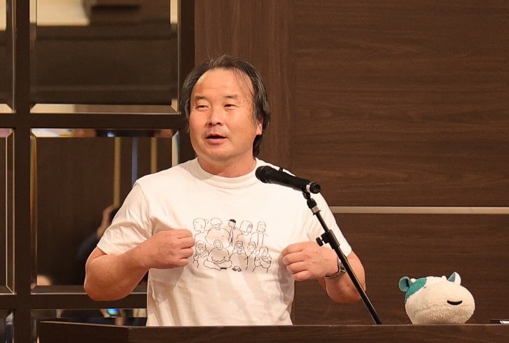 冒頭、県内産地のサンドファーム旭代表取締役の金谷雅幸さんが「私たちがパルを選ぶ理由」と題して自身のパルシステムとのつながりのエピソードを紹介しました。金谷さんはパルシステム東京の前身生協で配達担当として働いていた経験があり、利用者、生産者、役職員それぞれの視点でパルシステムを捉えています。