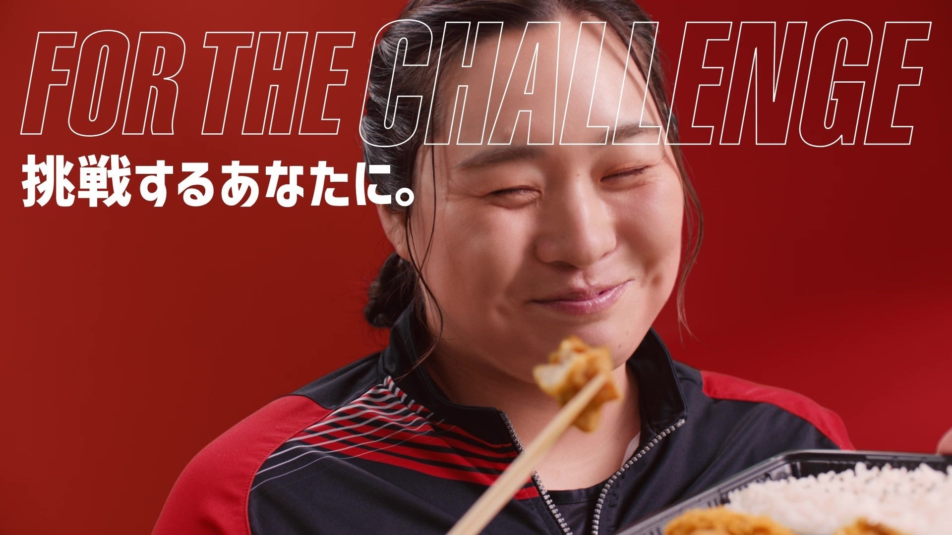 本動画では、リラックスした表情の北口選手が『スポーツ弁当 から揚&デミメンチ』をおいしそうに食べるシーンを中心に、スポーツを頑張ったあとのお弁当のおいしさを表現しています。