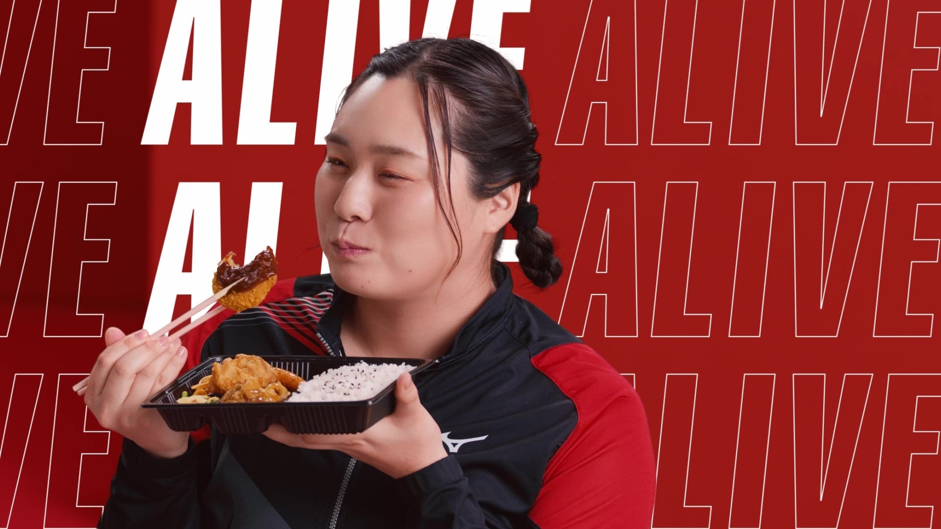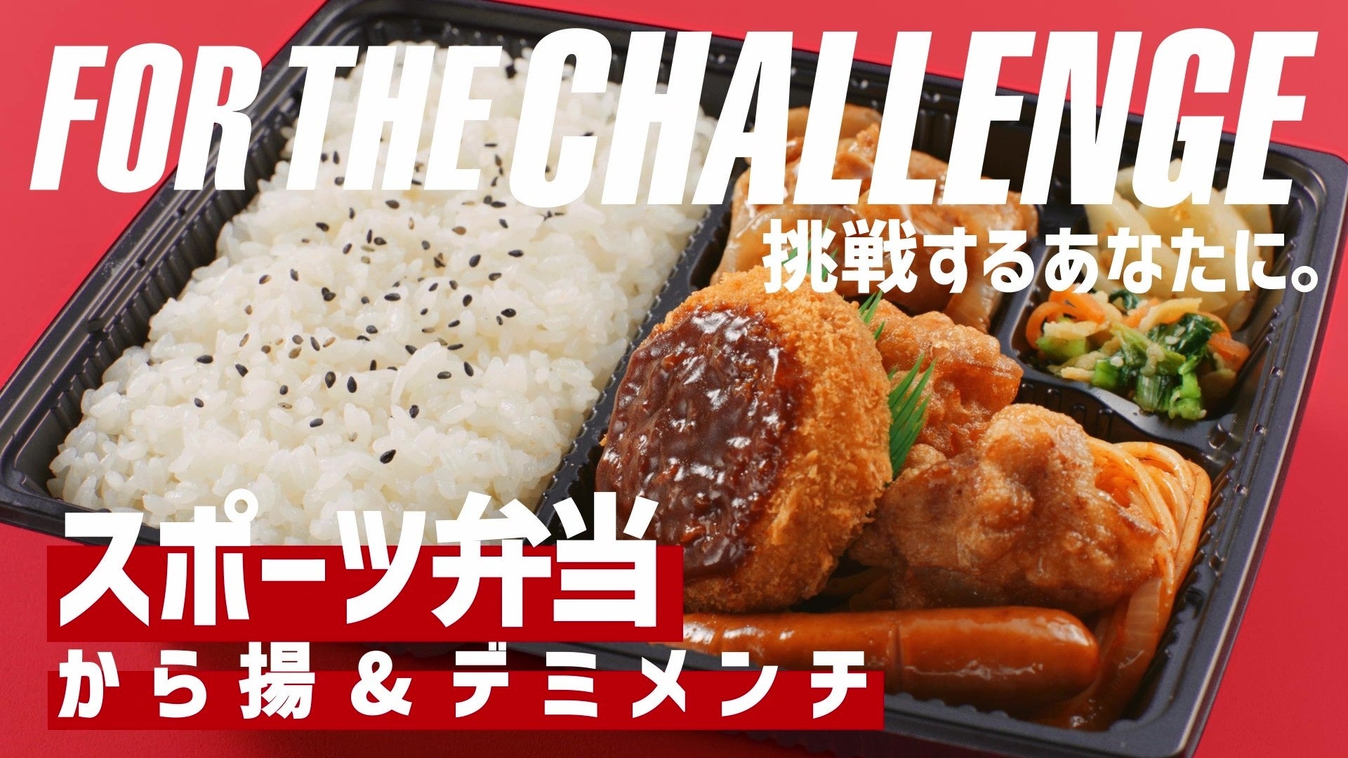 本動画では、リラックスした表情の北口選手が『スポーツ弁当 から揚&デミメンチ』をおいしそうに食べるシーンを中心に、スポーツを頑張ったあとのお弁当のおいしさを表現しています。