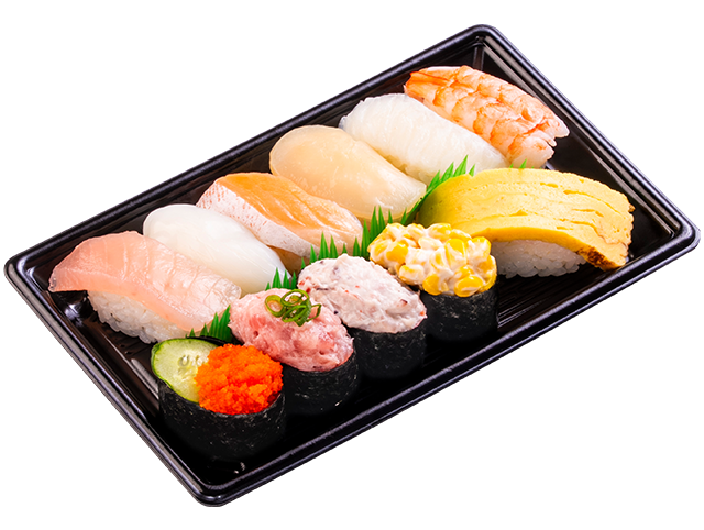 中とろ、まぐろ、えび、サーモン、つぶ貝、いか、煮穴子、ねぎとろ、甘えび、ししゃもっこ