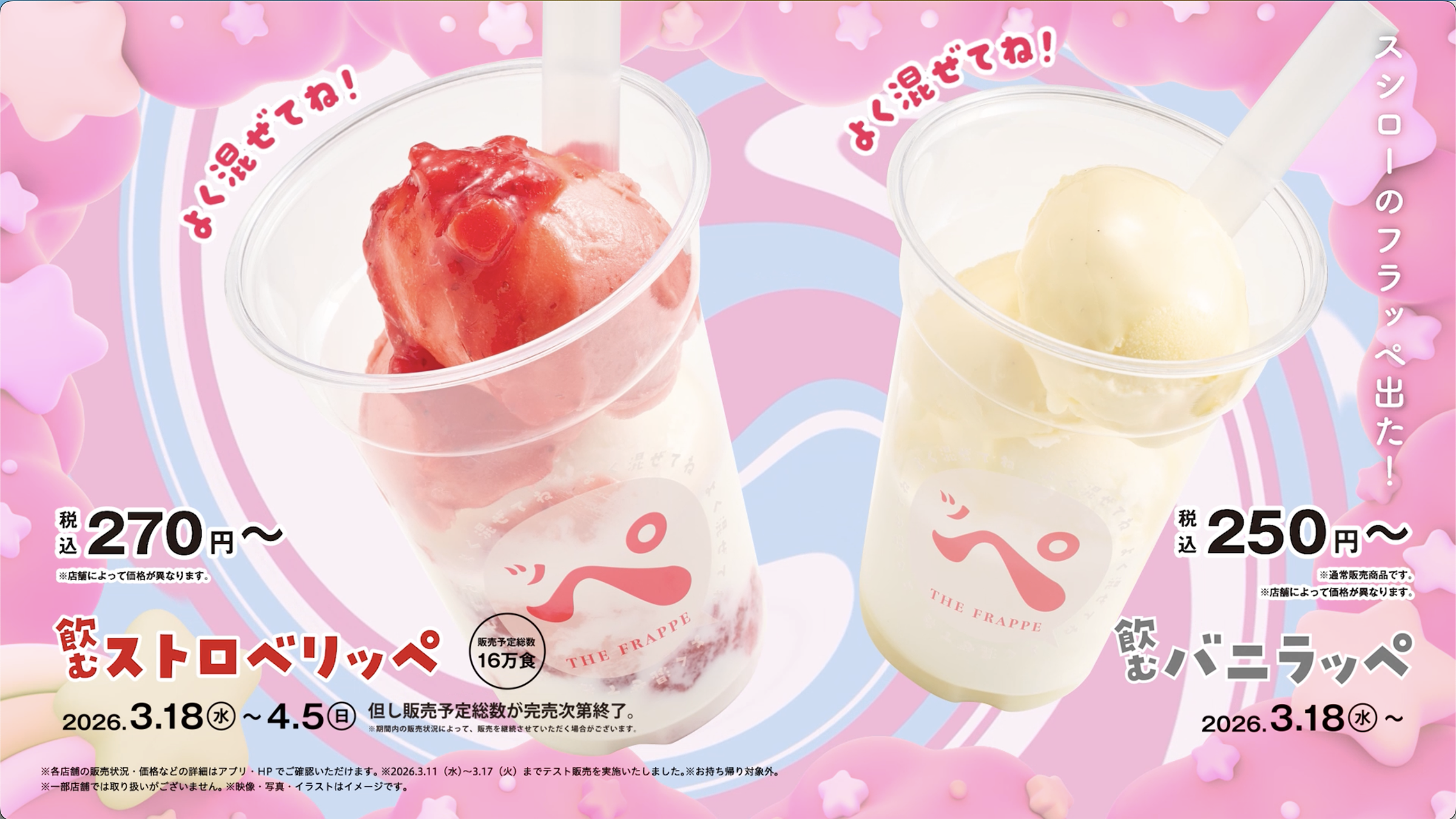株式会社あきんどスシロー(本社:大阪府吹田市、代表取締役社長:新居 耕平)は、“SUSHIRO Cafe”からの新提案として混ぜて楽しむひんやりスイーツ“フラッペ”が登場します。第一弾として3月18日(水)より「飲むストロベリッぺ」と「飲むバニラッぺ」を全国のスシローにて販売いたします。