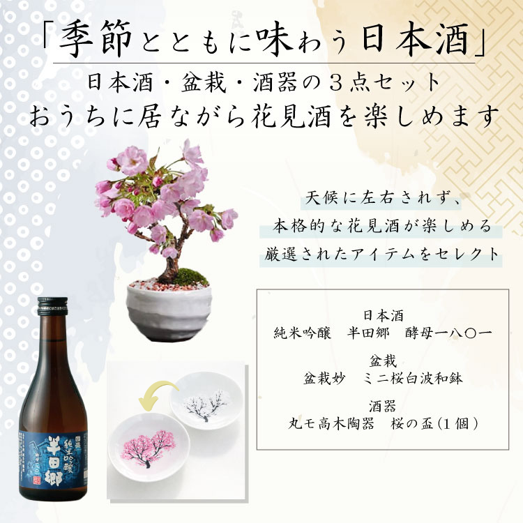 可憐に咲く桜の盆栽、味わい深い日本酒、お酒を注ぐと桜が浮かび上がる盃をセットにしました。