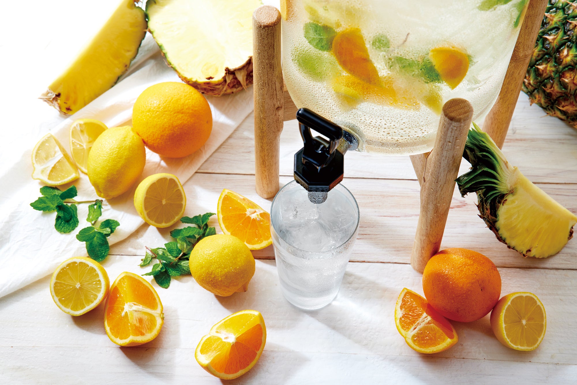 レモン、ミント、オレンジ、パイナップルの入った「デトックスウォーター」は、健康訴求だけではなく“味覚リセットドリンク”としても楽しめます。