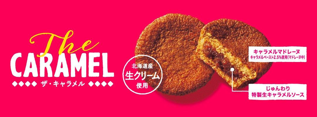 ・北海道産生クリームと生キャラメルソースを使用し、濃厚なキャラメルの風味があふれ出す贅沢な味わいに仕上げました。とろける生キャラメルソースがじゅんわりしみ込んだしっとり食感が、そのおいしさを一層引き立てます。