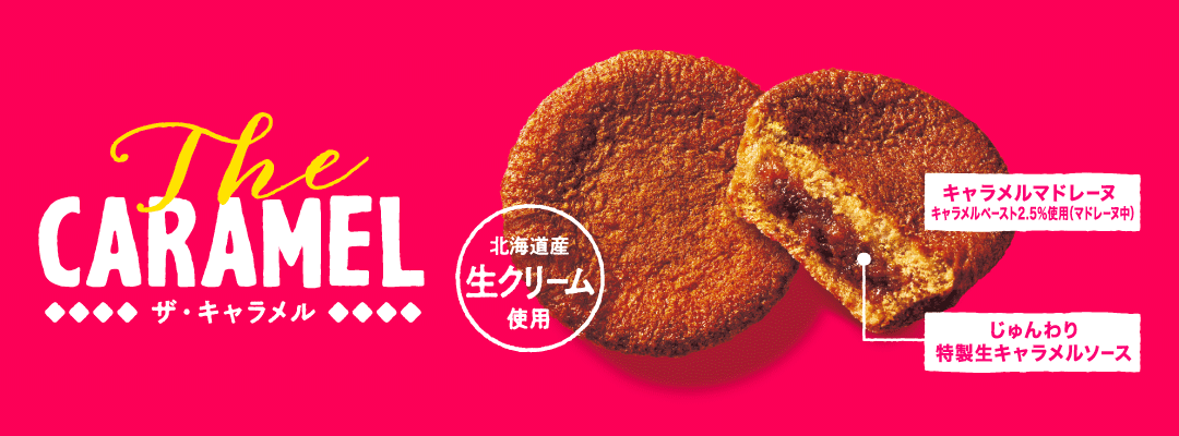 ・北海道産生クリームと生キャラメルソースを使用し、濃厚なキャラメルの風味があふれ出す贅沢な味わいに仕上げました。とろける生キャラメルソースがじゅんわりしみ込んだしっとり食感が、そのおいしさを一層引き立てます。