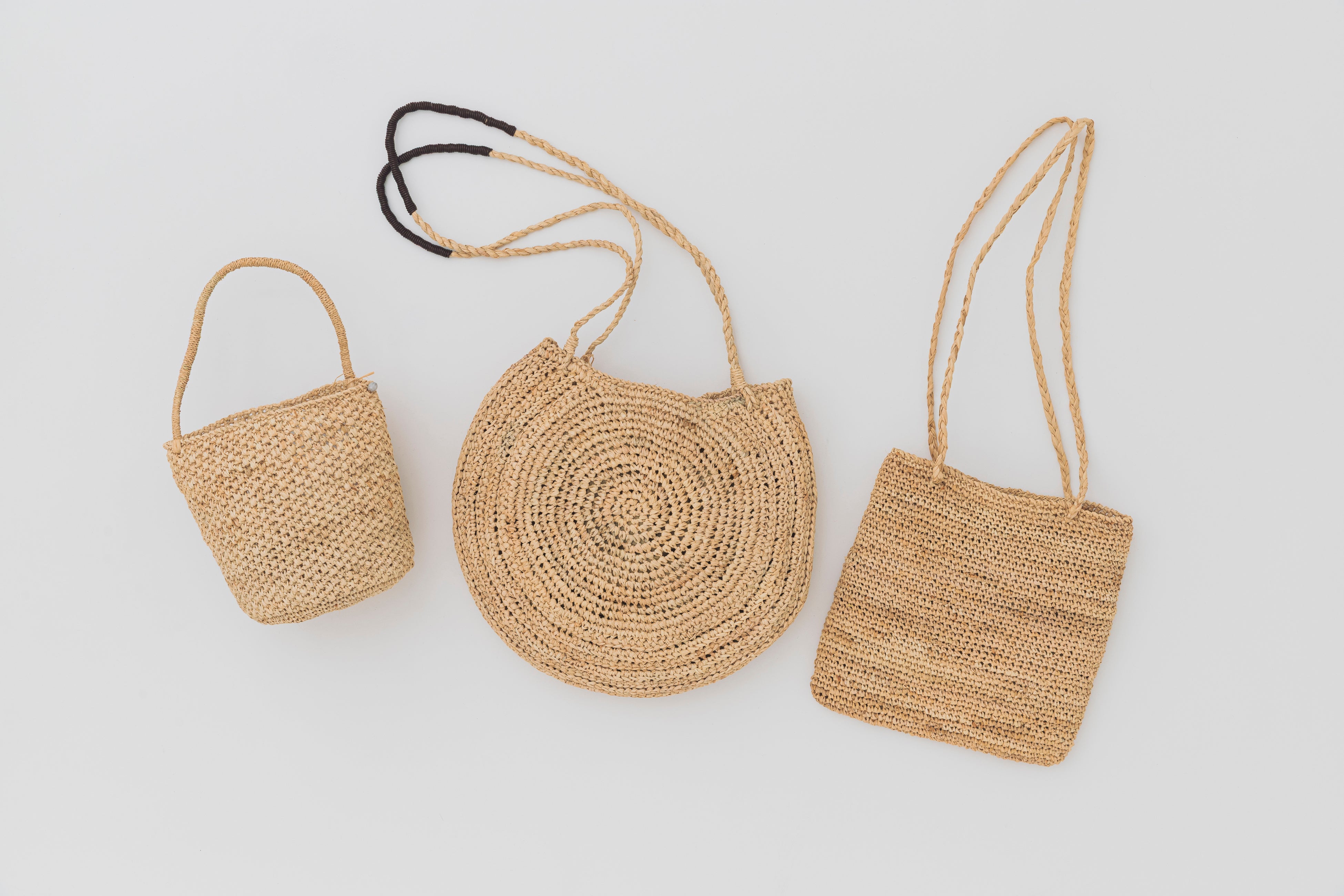 ヤシの葉を加工した「ラフィア」を丁寧に編み上げる帽子やバッグ。