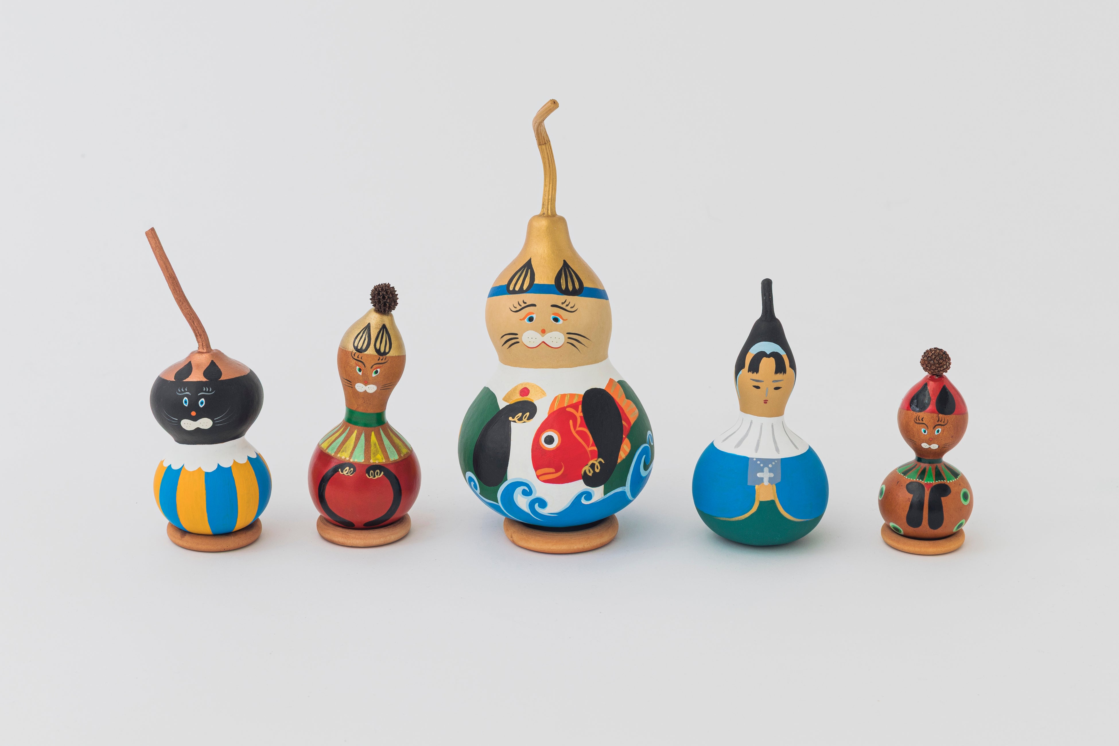 個性豊かな瓢箪に命を吹き込む「ひょうたんニャン太郎」など、両手で福を招く欲張りで愛らしい猫たちが人気です。