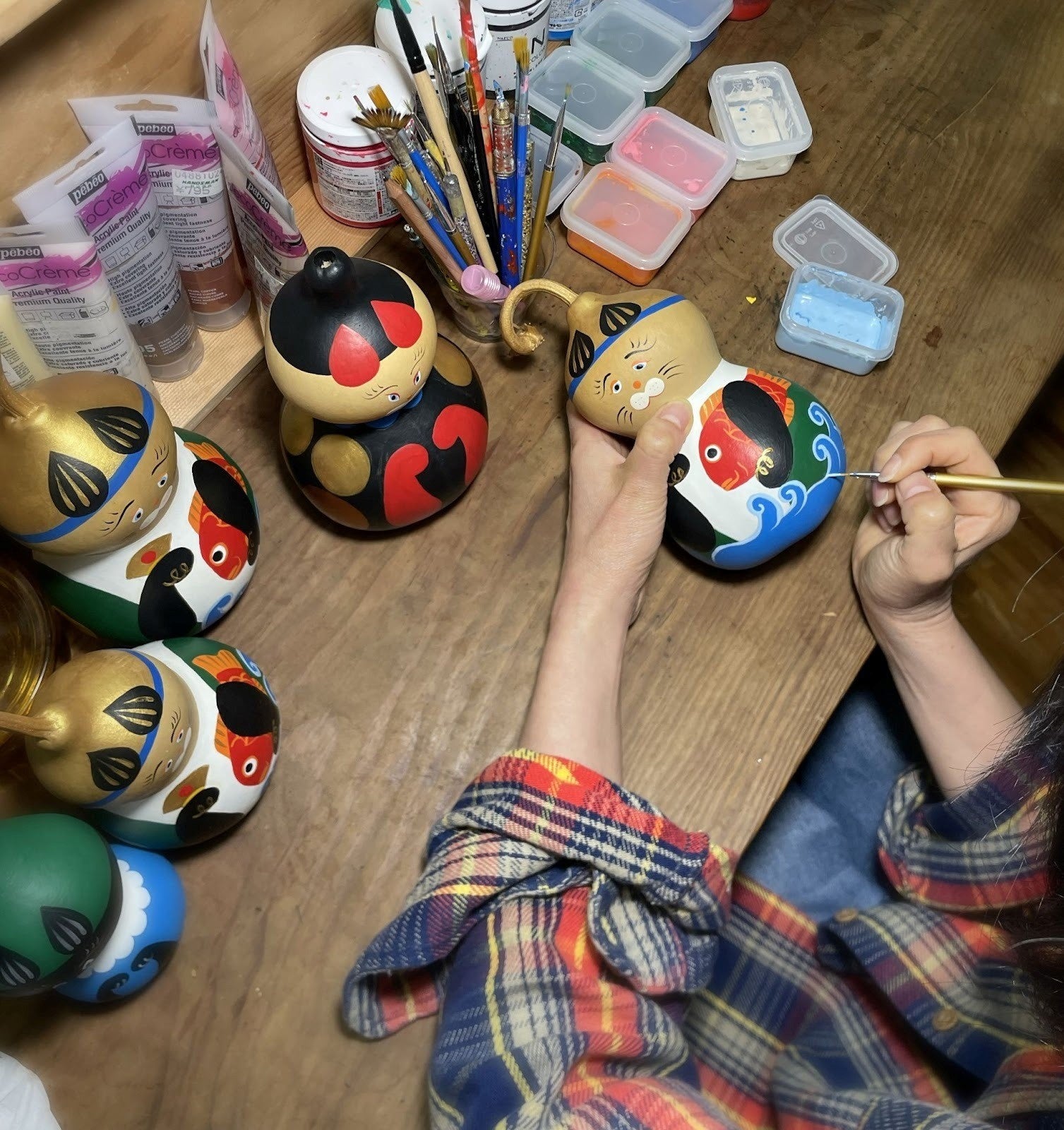 お顔が描かれたひょうたんの体に、水性の塗料で色を塗る絵付け体験です。