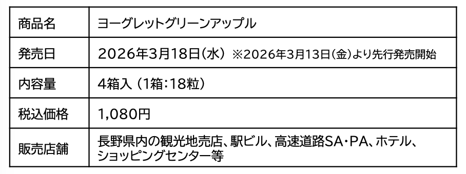 みやげ卸の株式会社タカチホ(長野県長野市、代表取締役社長:久保田一臣、以下タカチホ)は、長年愛され続けるアトリオン製菓のロングセラー菓子「ヨーグレット」に、信州産青りんご「ブラムリー」果汁を使用した、全国初の地域限定商品「ヨーグレットグリーンアップル」を2026年3月18日(水)より信州限定で発売いたします。