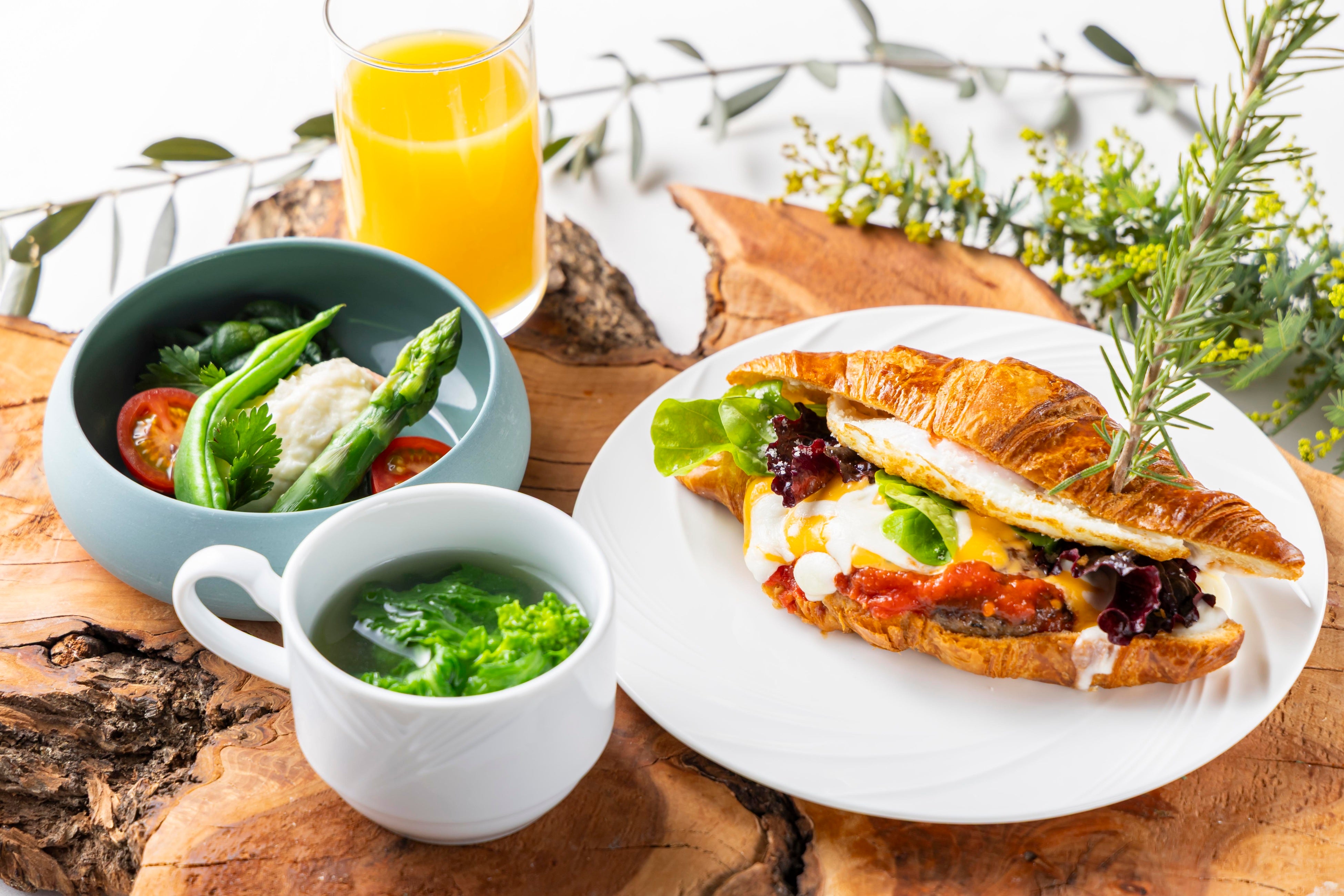 朝食『クロワッサンサンドイッチ チーズハンバーグ目玉焼き添え バージンバレーオリーブオイル風味のトマトフォンデュ』