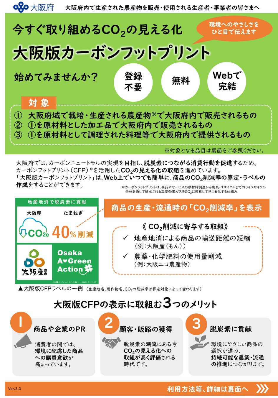 「大阪版カーボンフットプリント」は登録手続きや利用料は不要で、Web上でいつでも簡単に、商品のCO2削減率の算定・ラベルの作成を行うことができます。手軽に利用できる算定ツールと伝わりやすいラベル表示で、生産者や事業者による大阪版CFPの算定・表示と、消費者による環境にやさしい商品選択を後押しします。