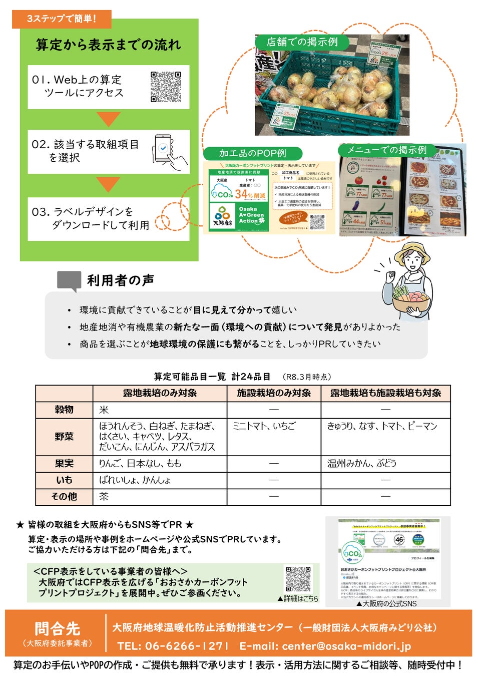 取組みを開始した令和4年度以降、多くの生産者様・事業者様に算定いただき、府内の直売所や小売店舗、農産物販売イベントにおいて、表示いただいています。