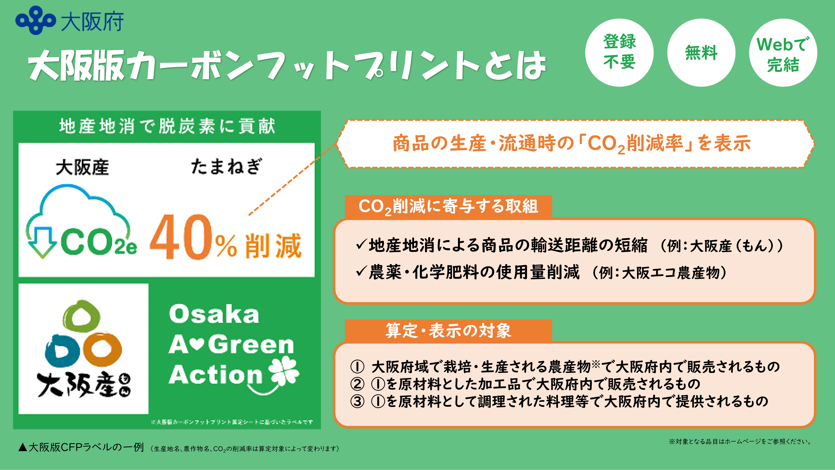 大阪版カーボンフットプリントとは、大阪産農産物を対象に、生産と流通段階で排出される温室効果ガスを二酸化炭素に換算し、脱炭素の取組みをCO2削減率として表示することです。大阪府では、大阪エコ農産物の農薬・肥料・燃料等の削減努力や、大阪産(もん)等の地産地消による輸送段階のCO2削減効果を見える化することで、有機農業や地産地消との相乗的な普及を図っています。
