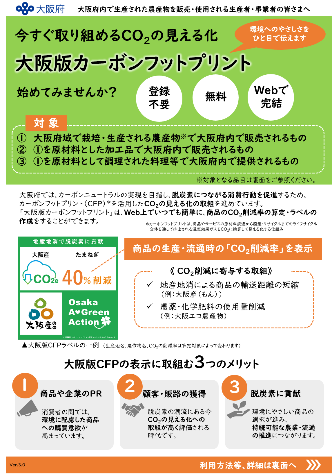 「大阪版カーボンフットプリント」は登録手続きや利用料は不要で、Web上でいつでも簡単に、商品のCO2削減率の算定・ラベルの作成を行うことができます。手軽に利用できる算定ツールと伝わりやすいラベル表示で、生産者や事業者による大阪版CFPの算定・表示と、消費者による環境にやさしい商品選択を後押しします。
