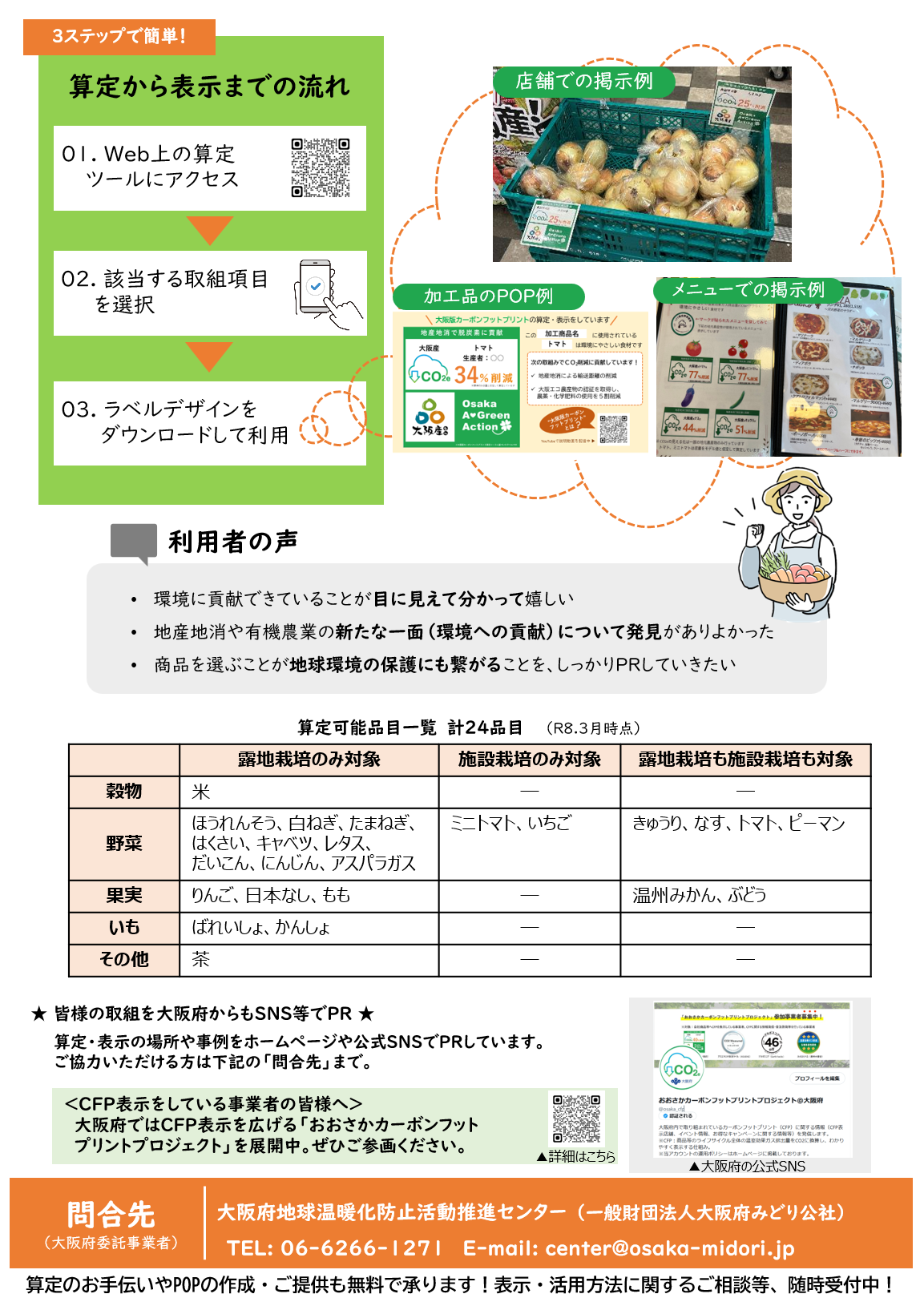 当センターでは、大阪府から委託を受け、算定のお手伝いやPOPの作成・ご提供を無料で承っています。また、表示・活用方法に関する個別相談も随時受け付けておりますので、お気軽にご連絡ください。