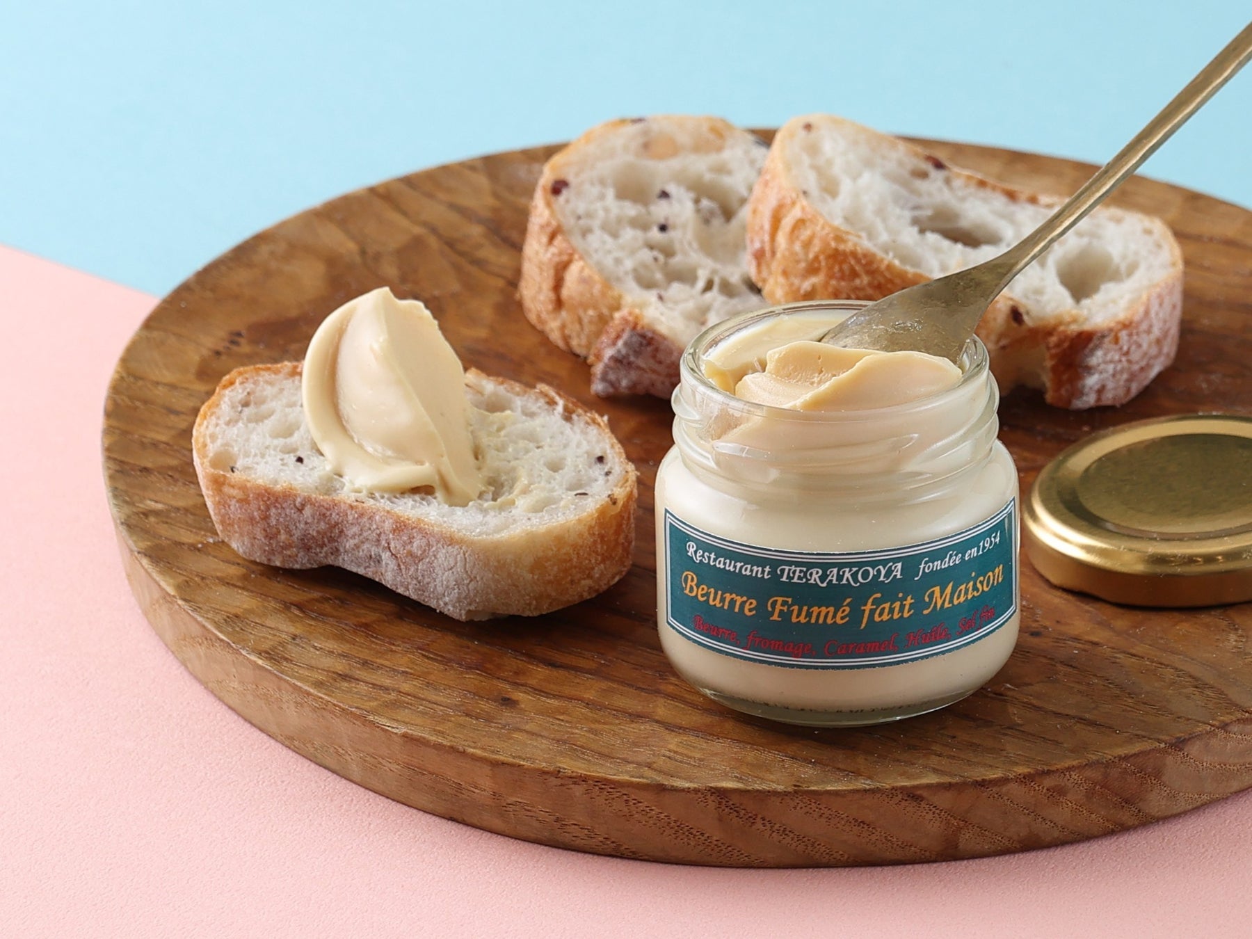 創業70年以上の小金井のフレンチレストラン「TERAKOYA」のオリジナルで、クリエイティブな万能調味料。生乳100%のフレッシュバターを、スモーキングハウスで丹念にスモークし、風味豊かで奥深い味わいに仕上げました。まろやかな味わいと、ほのかに感じる甘みが奥深いハーモニーを奏でます。パンやクラッカーにのせて香りをダイレクトに楽しむのはもちろん、パスタの仕上げに加えると贅沢な燻香が広がります。