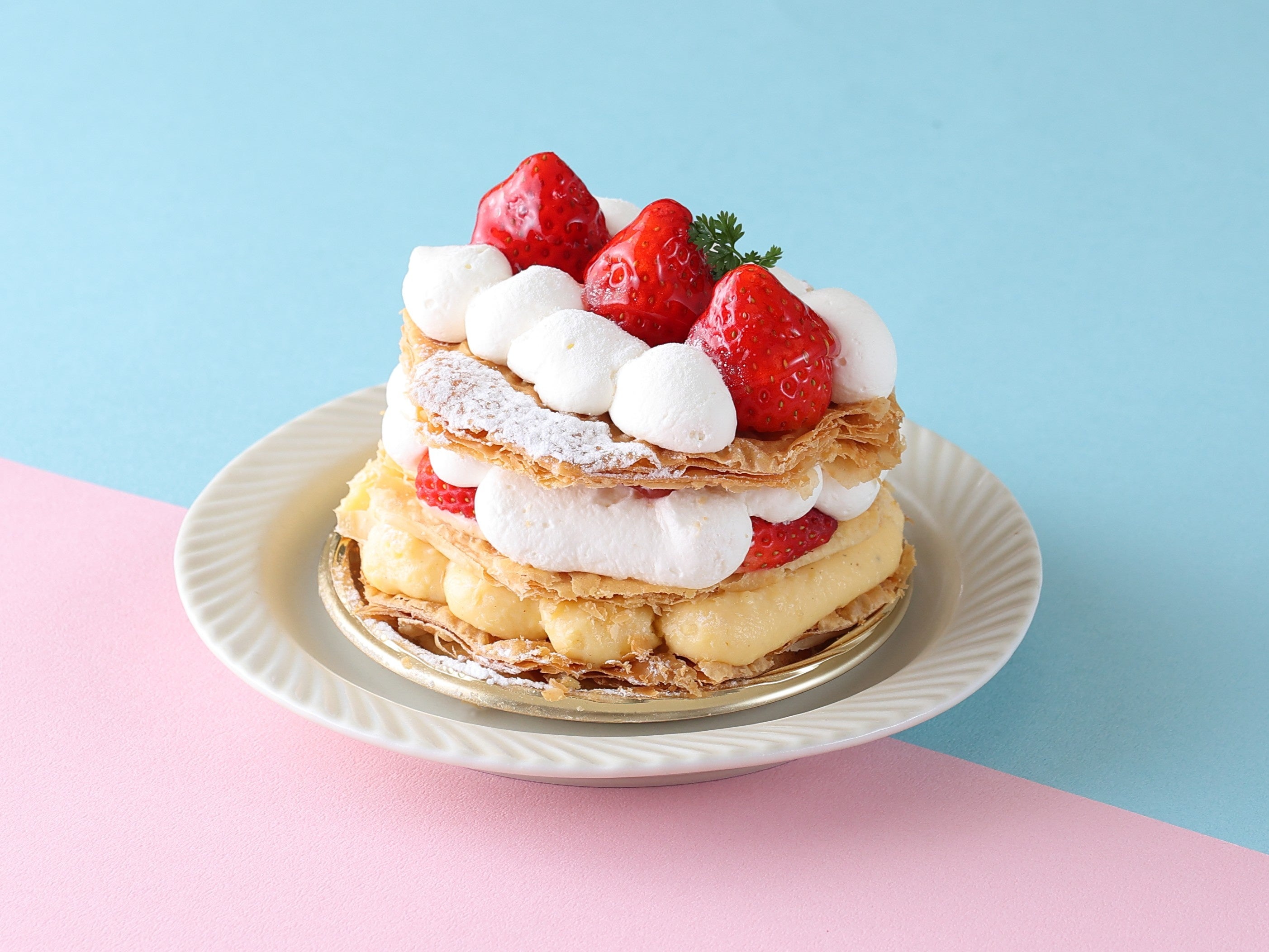 旬のいちごを贅沢にあしらったミルフィーユ。 あっさりと軽やかな口どけながら、深いコクが広がる厳選生クリームを惜しみなく使用しました。さらに、牛乳本来の甘みと旨みが凝縮された自家製カスタードクリームとの相性は抜群!ザクザクと香ばしいパイ生地と、こだわりクリームが奏でる絶妙なハーモニーを、心ゆくまでお楽しみください。