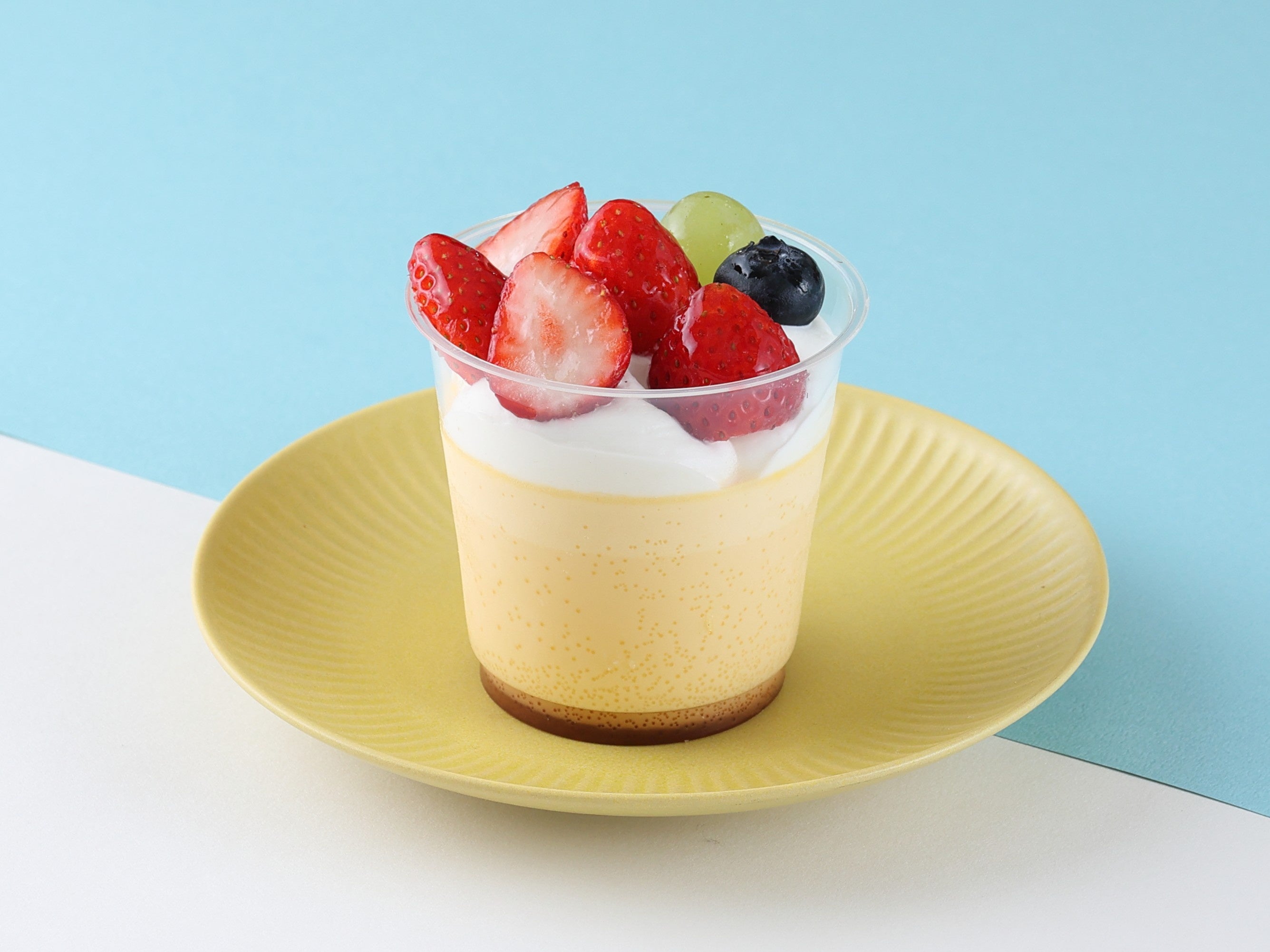 味わい豊かな卵に、北海道産の牛乳と生クリーム、さらに生乳や牛乳から水分を蒸発させてコク深く仕上げた「濃縮乳」を贅沢にブレンドした特製プリンです。たっぷりの生クリームとともに、旬のいちごやブルーベリー、ぶどうを彩りよくトッピング。口いっぱいに広がる、至福なミルクの味わいをお楽しみください。
