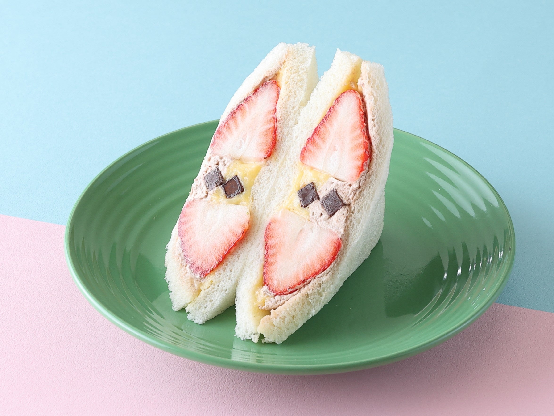 クリーム好きにはたまらない、なめらかに仕立てた「カスタークリーム」と濃厚な「ショコラクリーム」の2種で、大粒のいちごをサンドした贅沢な一品。カスタードよりも軽やかな口当たりの「カスタークリーム」は、ショコラクリームといちごの酸味とも調和し相性抜群です。中央にトッピングした生チョコが食感のアクセントを添える、見た目も華やかな、デザートサンドです。
