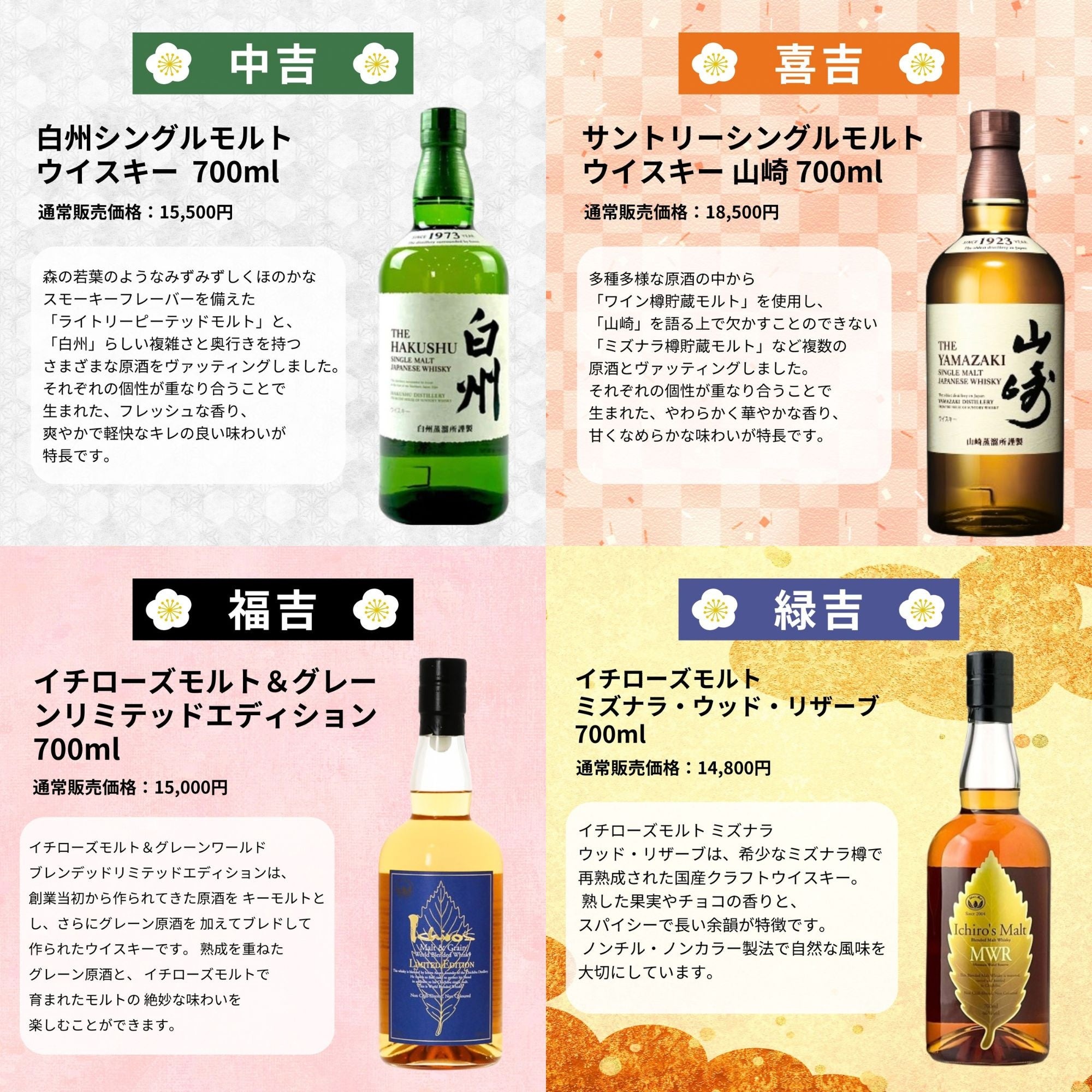 幻のウイスキーである「竹鶴25年」を筆頭に、「山崎12年」「余市10年」といった入手困難な長期熟成ボトルを封入しています。