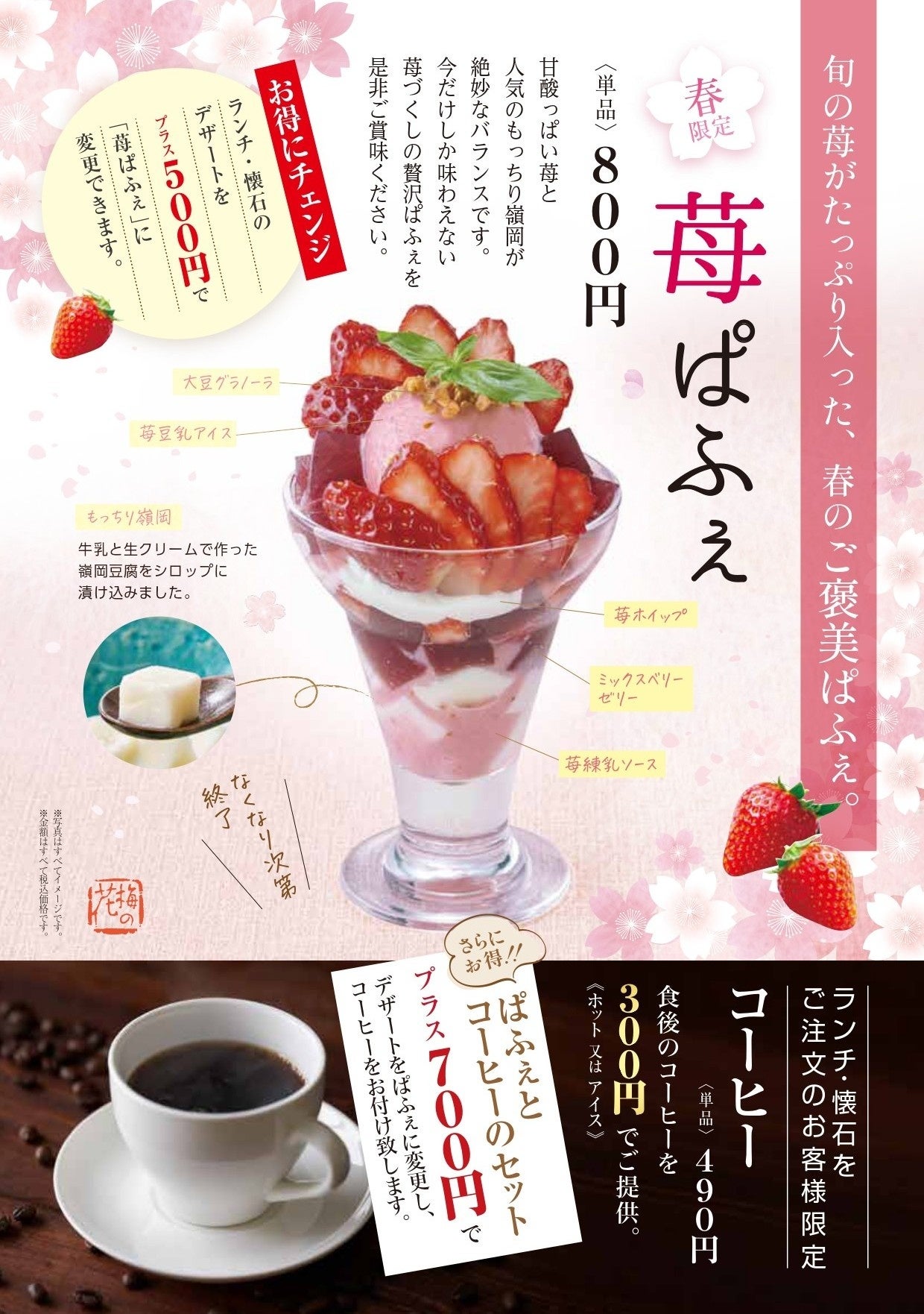 さらに、ランチ・懐石のデザートを、プラス500円で「苺ぱふぇ」にお得に変更できます。