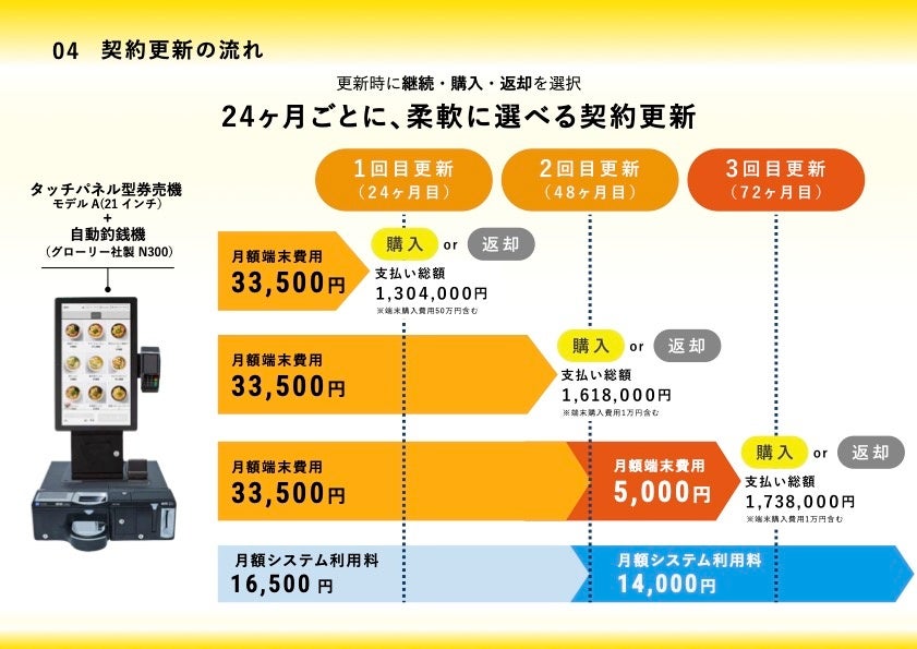 ① 初回更新24ヶ月目に、端末購入費用¥500,000をお支払いいただければ、お客様に所有権が移ります。また、返却を選ぶこともでき、更新のタイミングであれば