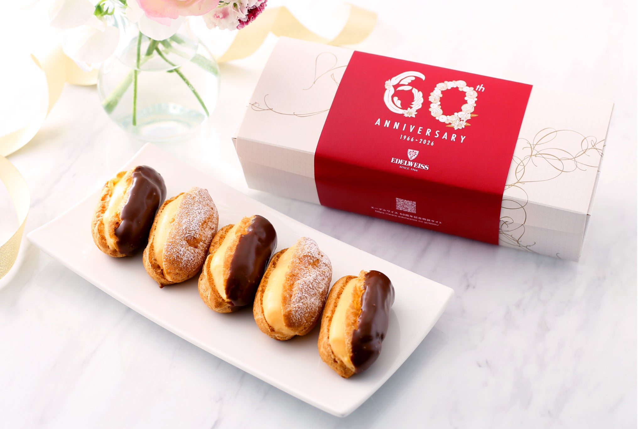 エーデルワイスの代表ブランドである〈アンテノール〉の店舗にて、エクレールとショートケーキを60周年にちなみ、特別価格600円でご提供いたします。 いつもお召し上がりいただいている方も、はじめましての方も、ぜひこの機会にお買い求めください。