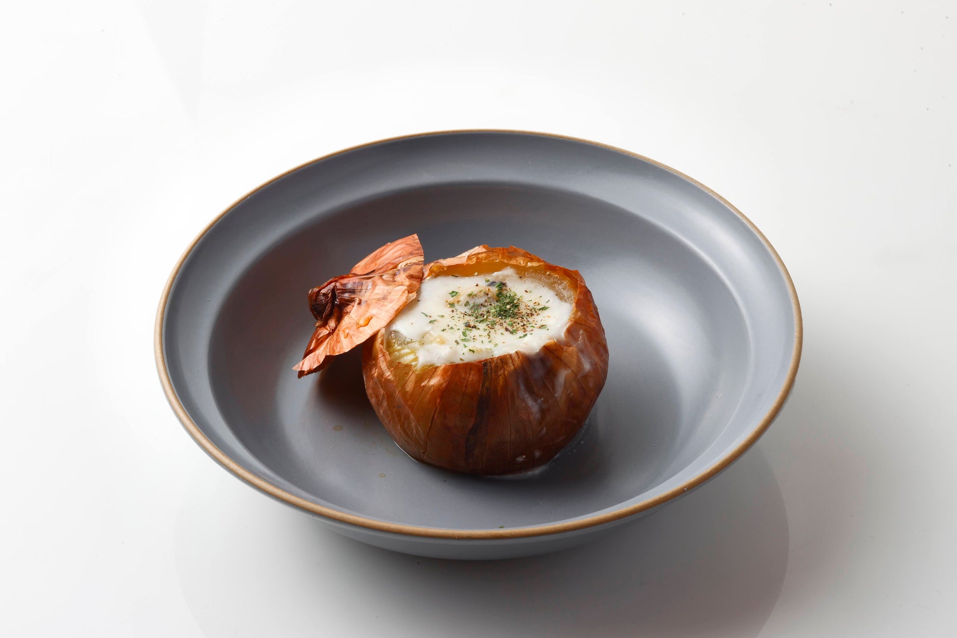 玉葱を丸ごと一個使い、じっくり火を入れて甘みを引き出した濃厚クラムチャウダー。