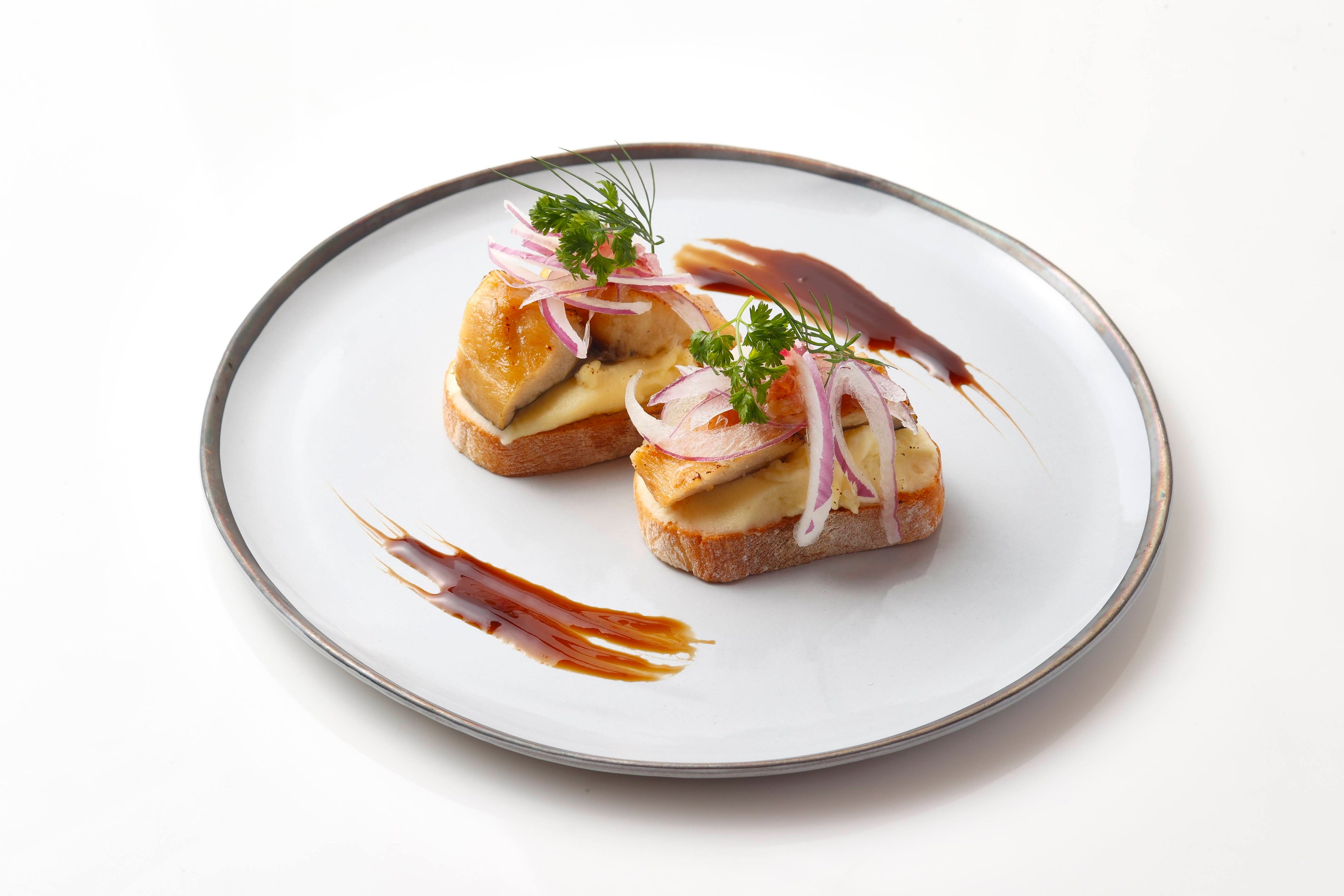 燻製したとろサバの旨みと、なめらかなマッシュポテトを合わせたブルスケッタ。