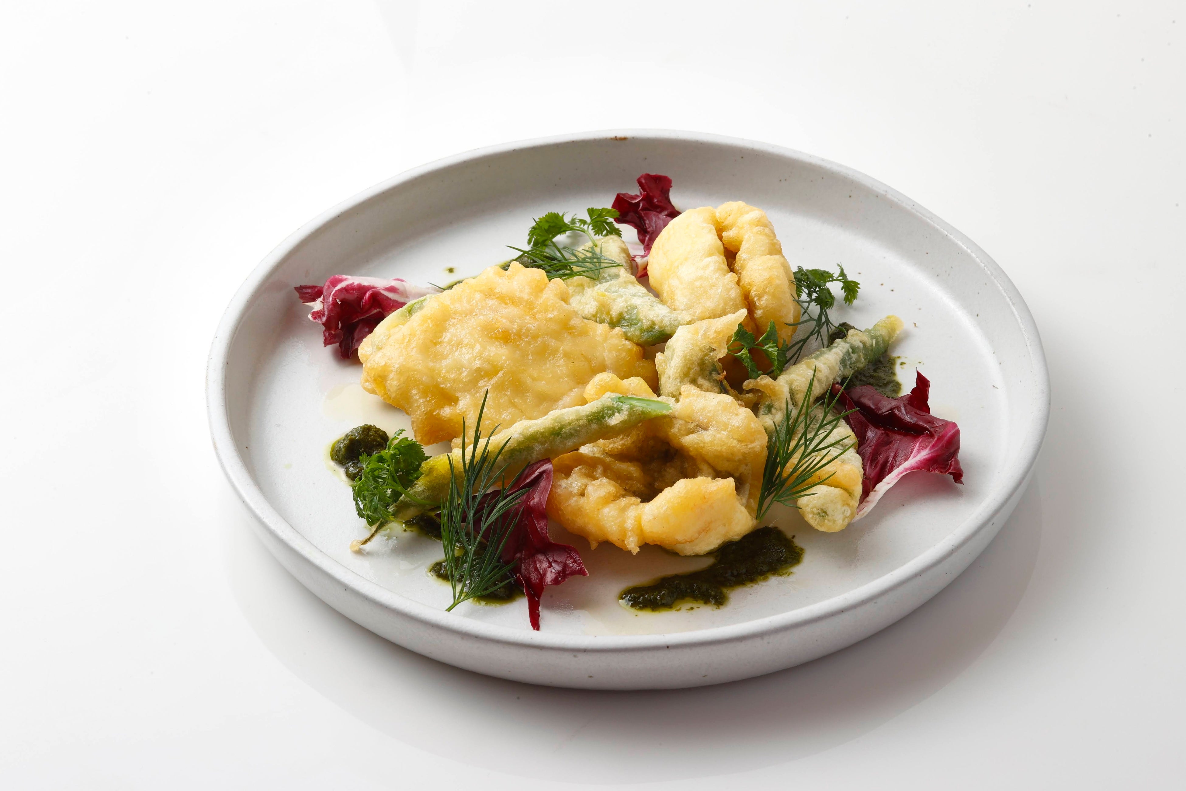 季節の素材を軽やかな衣で揚げたフリット。にんにくの風味が効いたアイオリソースで楽しむ一皿。